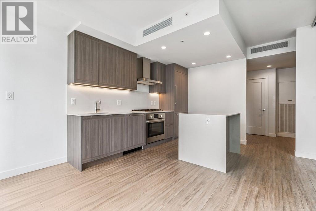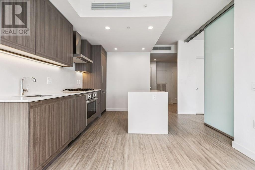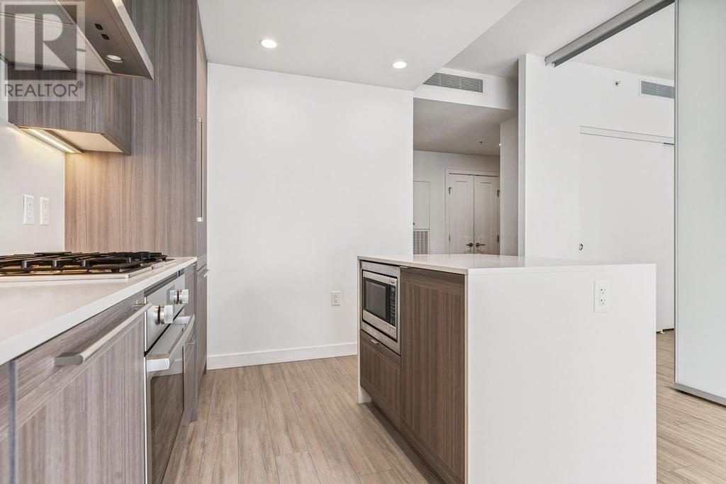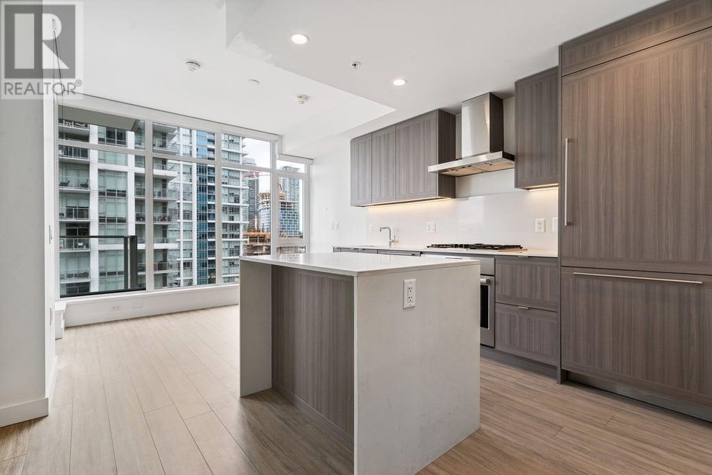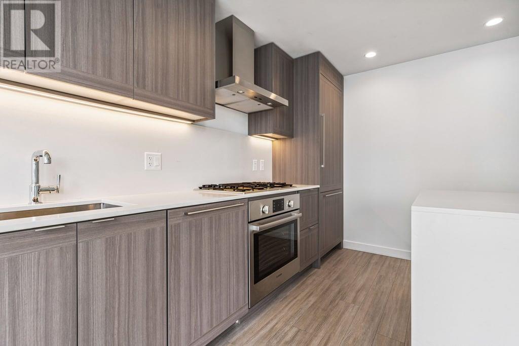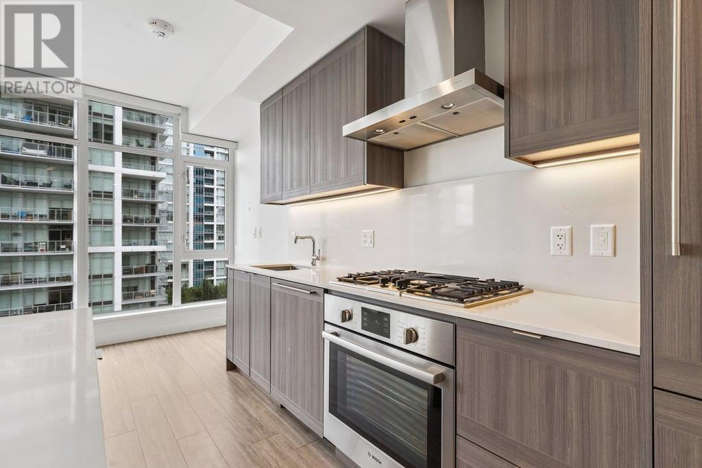 This 536sf 1 bedroom 1 bathroom unit offers nice views from the 118sf balcony. Featuring top-of-the line stainless steel Bosch gas cooktop, Bosch wall oven, sleek integrated fridge and dishwasher, Panasonic microwave with trim kit, stunning quartz counters, and front loading washer/dryer. Both the kitchen and bathroom provide LED under-cabinet accent lighting to highlight the polished chrome fixtures. The 4 pcs bathroom showcases stone counter with under-mount sink, an extra wide vanity mirror, modern rectangular cornered bath tub, 12 X 24 ceramic tiling, and an adjustable shower head. The bedroom looks out to the large balcony with floor to ceiling windows. Access to the balcony is just off the living room. Rent includes one underground parking stall and one storage locker. (id:48970) Show More