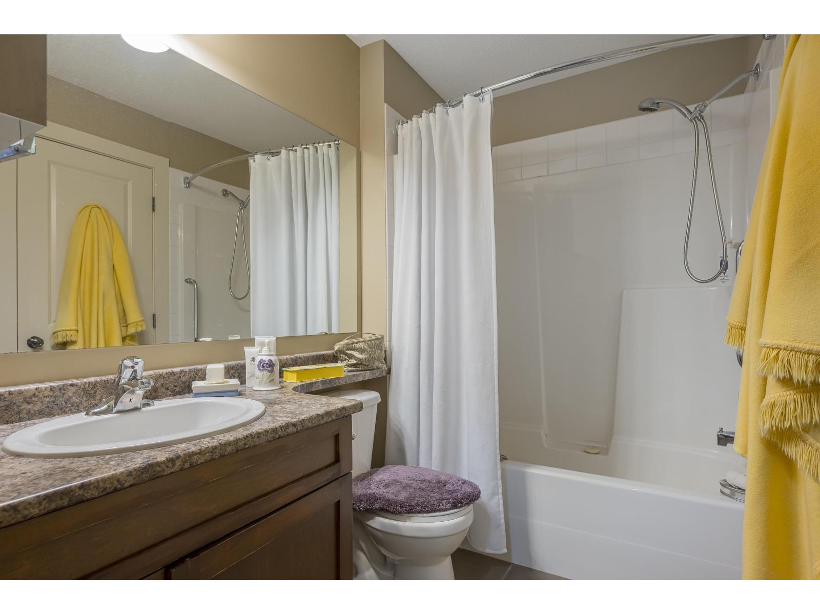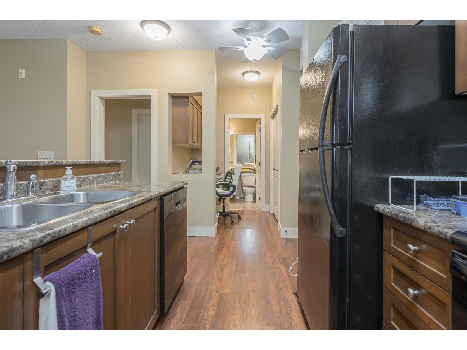 Welcome home to this exceptionally spacious one bedroom, ground level unit that has been meticulously maintained. Relax on your covered garden patio with mountain views and access from both the primary suite and living room. Other features include a lovely built-in-desk, electric fireplace, new appliances, newer paint, in-suite storage area, a/c and an abundance of natural light. This well maintained complex with wheel chair access is centrally located to all levels of shopping and entertainment. Strata allows for one cat and/or one small dog. (id:48970) Show More
