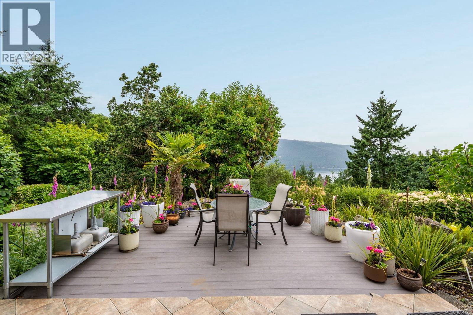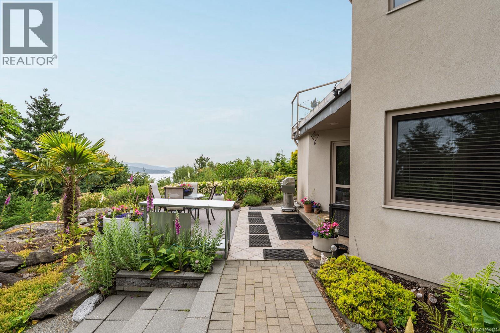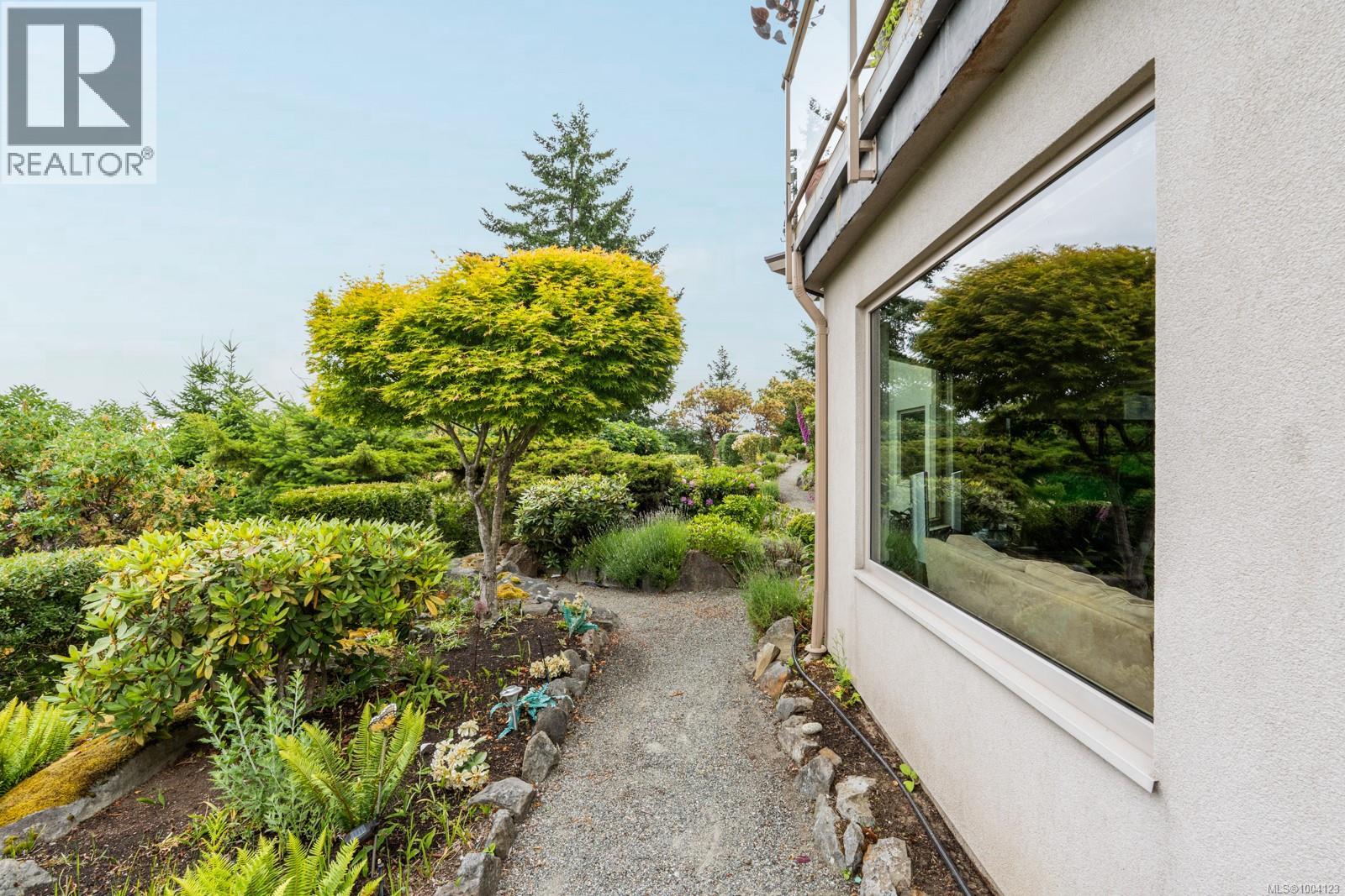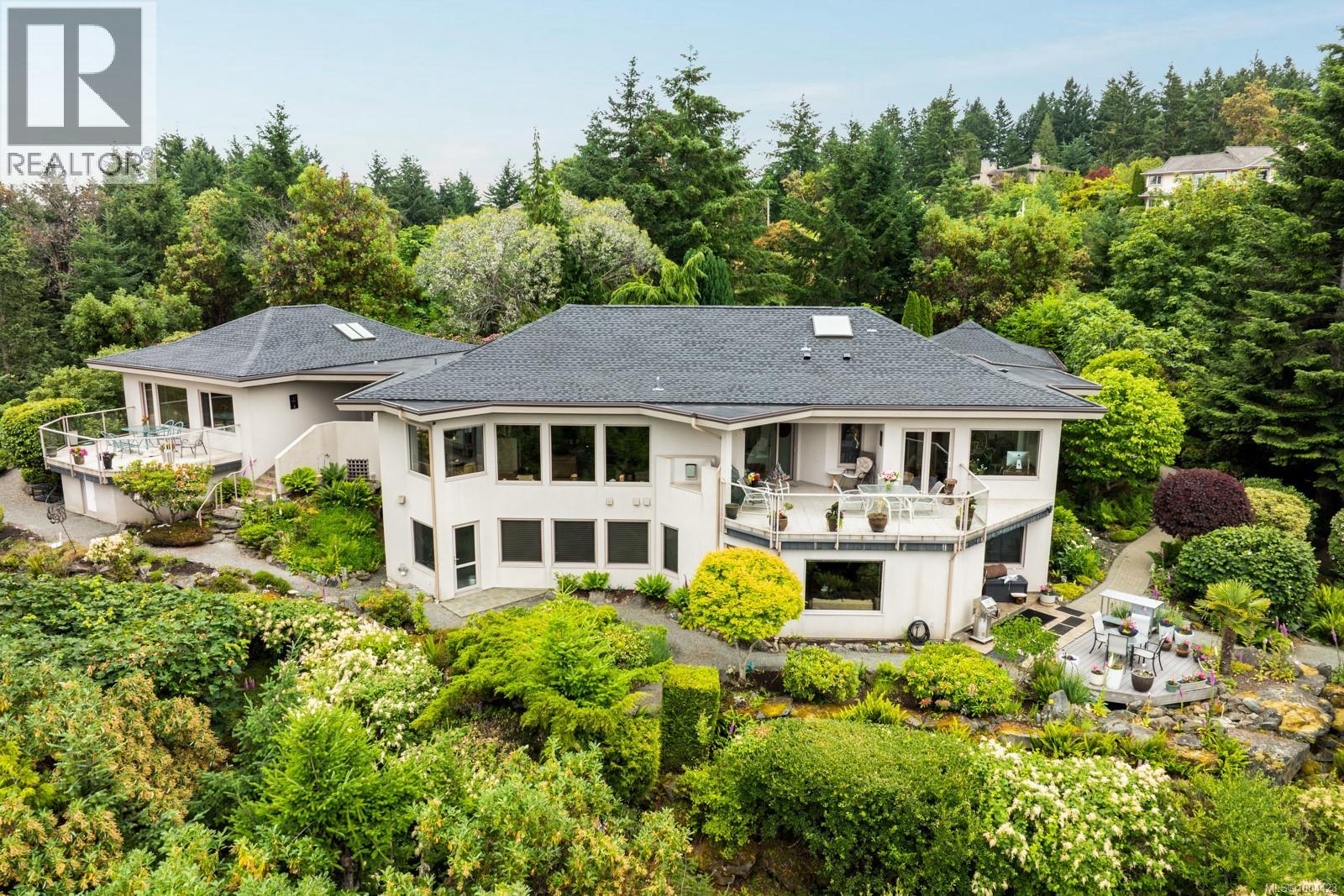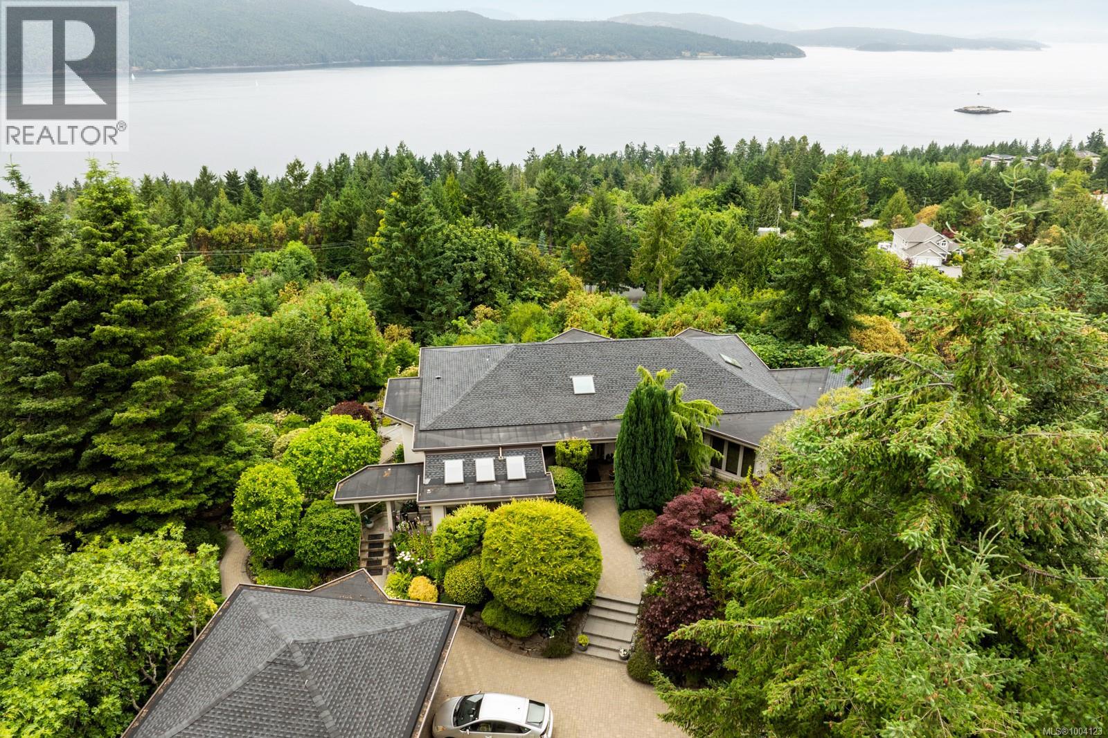 This exceptional residence, envisioned and designed by renowned Canadian architectural designer Klaus Hoffman, sits atop a beautifully elevated property offering sweeping 180° views of the Salish Sea—from Salt Spring Island to the distant mountains, & northward toward Maple Bay and Duncan. Carefully chosen for its light exposure & natural beauty, the home is immersed in tranquility & surrounded by nature. The home blends into its lush surroundings, with a mature, sculpted rock garden and landscape of Arbutus, Pine, Cedar, Eucalyptus & flowering trees—including Magnolia, Lilac, Rhodos, Roses, and Peonies. Backing onto Sycamore Park for added privacy, the grounds also feature a tranquil water pond, fenced vegetable garden, & a full irrigation system. A visionary custom structure, the house was constructed with architectural precision, utilizing a reinforced frame to reduce EMF exposure & ensure enduring safety on its rocky foundation. Inside, bamboo flooring, EuroLine windows & doors, and radiant floor hot water heating set a refined tone. The gourmet kitchen, crafted by an award-winning designer, includes rift-cut oak cabinetry, granite counters, double convection ovens, a Dacor cooktop, and Miele dishwasher. A wine room, private office, and bar add functionality and elegance. The home also includes a private 1-bedroom suite with full kitchen, laundry, and private entrance—ideal for guests or extended family. Additional upgrades include a new certified asphalt roof (2023), eight skylights, new interior paint on main level (2025), EV charger with monitor, whole-home & garage surge protectors, propane fireplace, hot water tanks (2025), professional landscaping & an advanced security system & direct fire alarm. Located just minutes to the ferry, airport, highway & the town of Sidney, this rare offering combines privacy, design pedigree, and breathtaking views in one of North Saanich’s most desirable settings. Zoning allows for an additional guest or caregiver cottage. (id:48970) Show More