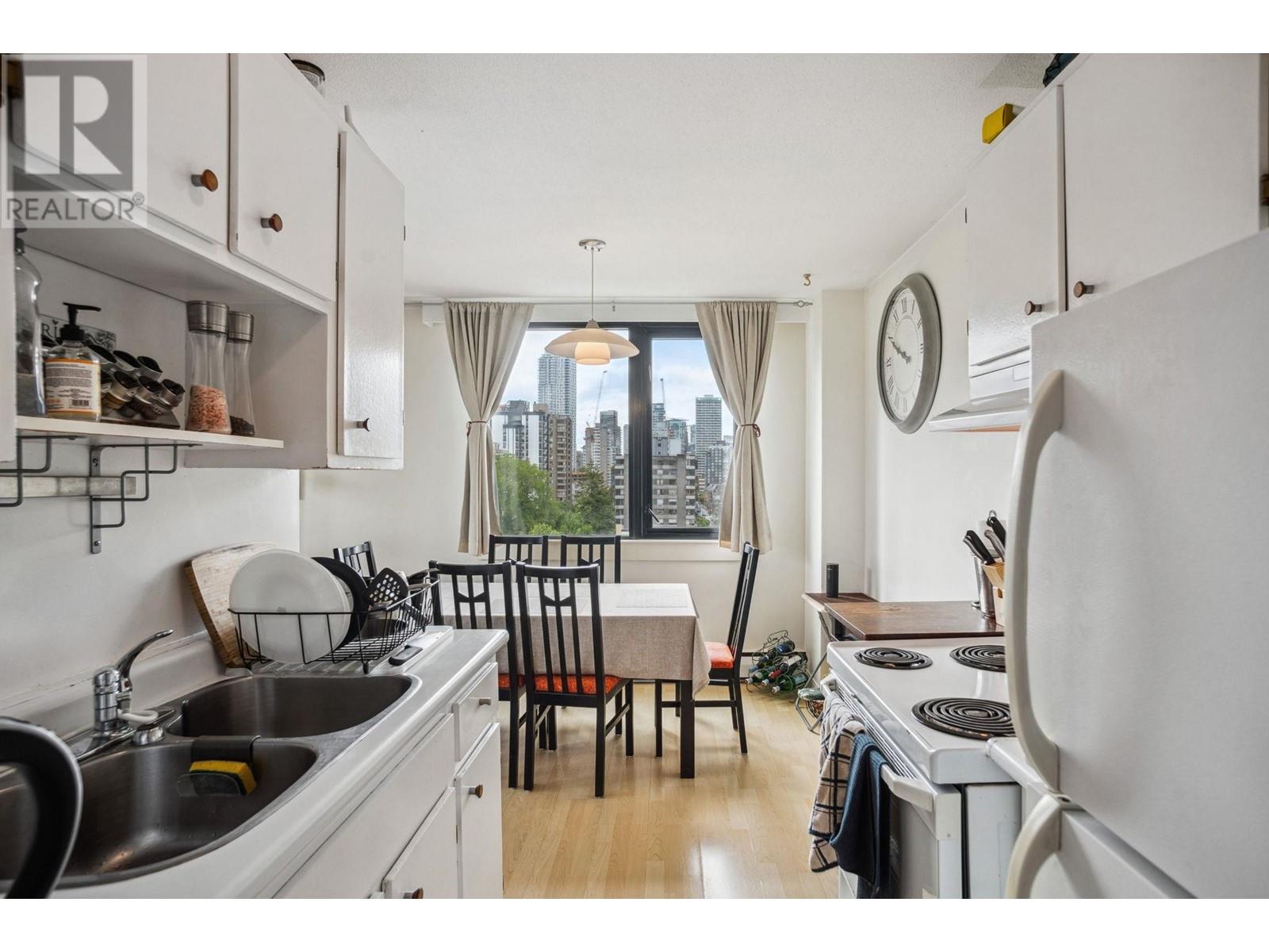 Welcome to this bright and spacious 1-bed corner unit in a solid concrete building on a quiet, tree-lined West End street. Enjoy stunning North Shore mountain views and peek-a-boo water views from the balcony. NE exposure brings in great light. Amenities include an outdoor pool, rooftop deck with panoramic views, secured parking, storage, and more. Rentals allowed, 1 cat OK. Low monthly fees cover heat, hot water, taxes, and more. Just steps to English Bay, seawall, transit, and shops. Prepaid leasehold to 2073-ideal to live in or as an ideal investment. Book your showings now! (id:48970) Show More