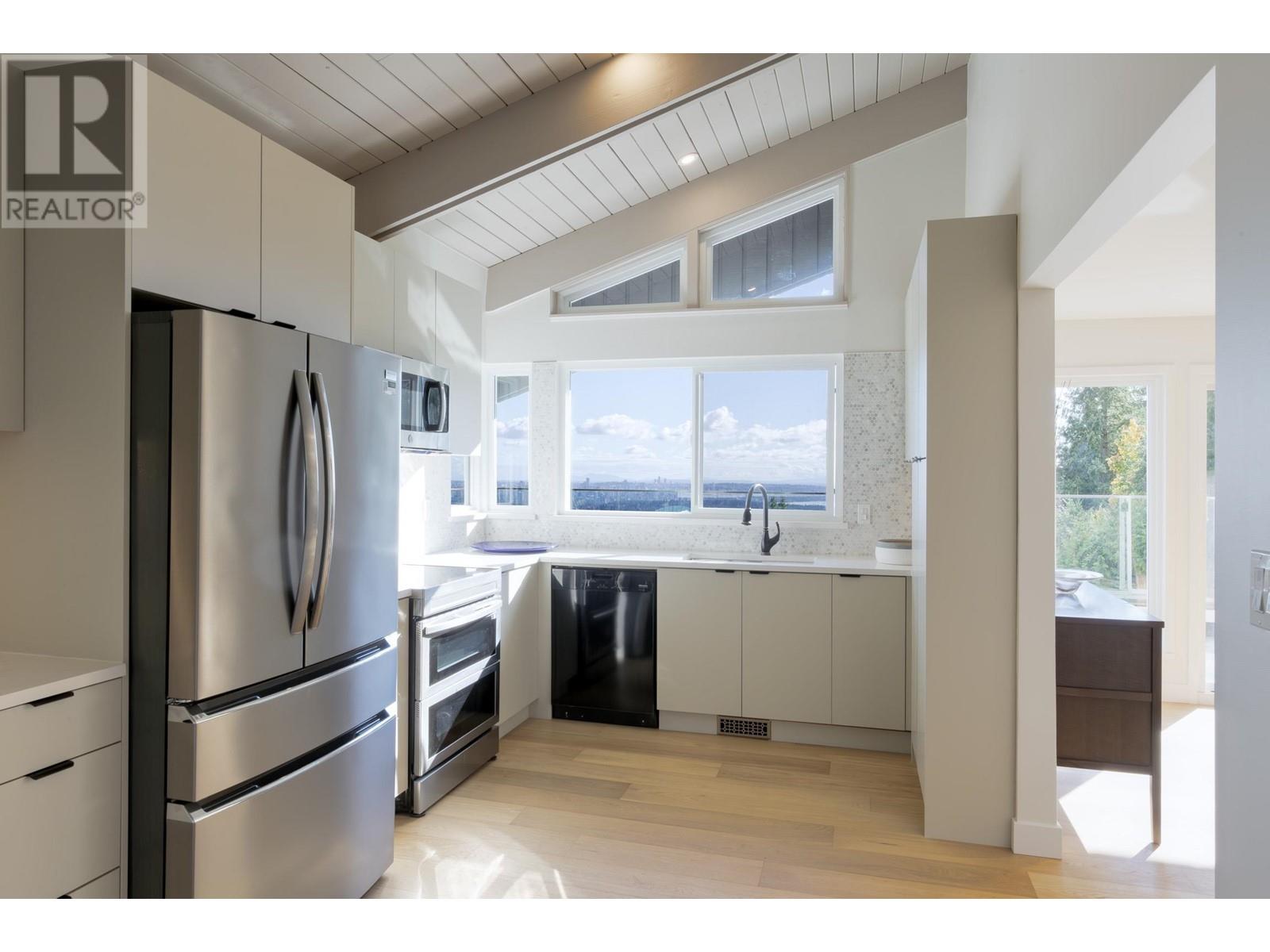 Stunningly renovated West Coast Modern home featuring sweeping city & water views.Extensively renovated in 2024 by award-winning MYK Construction, this 4-bedroom residence features an open-plan concept design. Charming one-level attached coach house with sleeping loft enhances the space and adds versatility for multigenerational living. The grand foyer, with its raindrop pendant and 3 level open glass staircase, leads effortlessly from the main floor, which includes a recreation room/office, 3 bedrooms & den with light wide plank flooring. Upstairs, enjoy entertaining in the vaulted ceiling living space, featuring a massive panoramic view deck, sun-filled living room with a feature fireplace, and a large dining area that flows into the chef´s kitchen with neutral cabinetry, breakfast bar, pantry, and access to private outdoor spaces. Spacious, private Primary bedroom with vaulted ceilings & steam shower ensuite. Located minutes from Sentinel High & Chartwell Elementary, Capilano Golf & Hollyburn Country Clubs. (id:48970) Show More