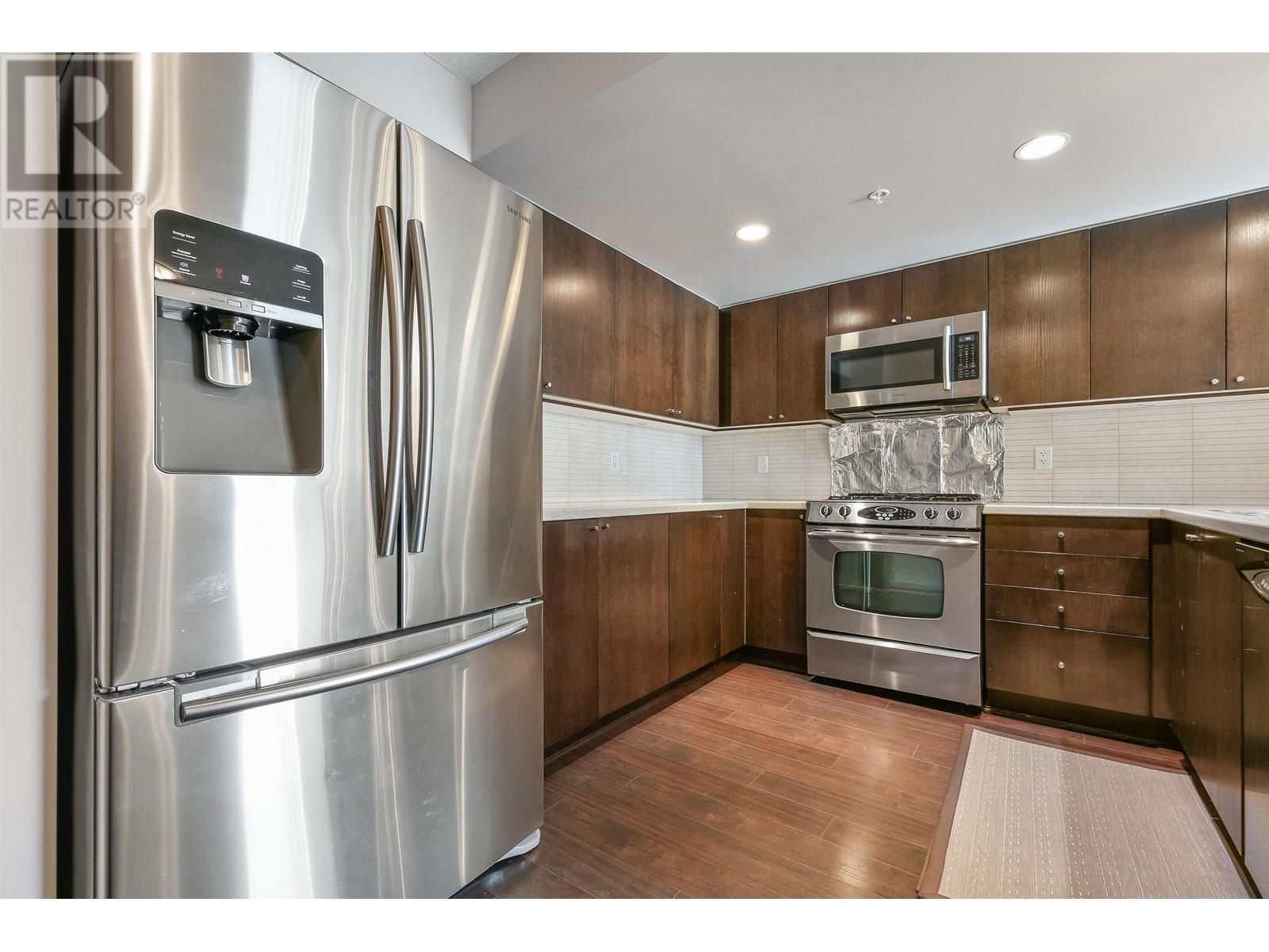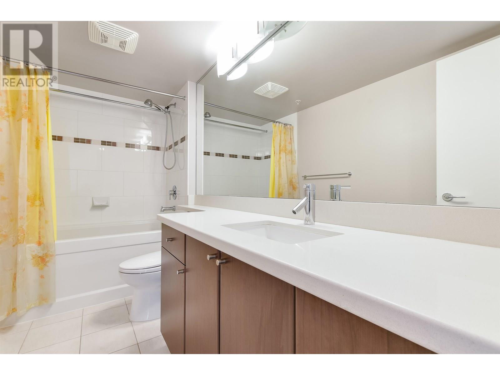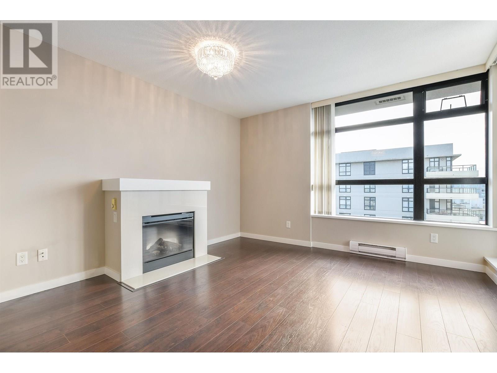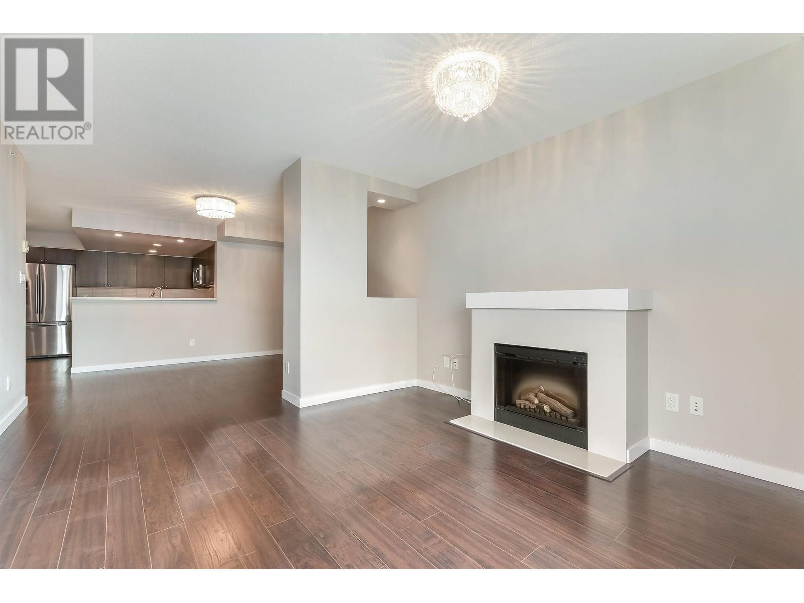 Spacious 1017sf 2-bedroom, 2-bathroom condo with upgraded engineered wood floors and a large rectangular balcony offering North Shore mountain views. The living room features an electric fireplace, grand ceiling light, and balcony access. Adjacent dining area has a modern light fixture and semi-partition wall. The gourmet kitchen includes stainless steel appliances with gas range, stone countertops, tiled backsplash, and three sides of veneer cabinetry. The primary bedroom offers a ceiling fan and a 3-piece ensuite with walk-in shower, stone vanity, and full-height mirror. The second bedroom also opens to the balcony. The main 4-piece bathroom includes an extended vanity and soaker tub. Rent includes one parking stall and a storage locker. (id:48970) Show More