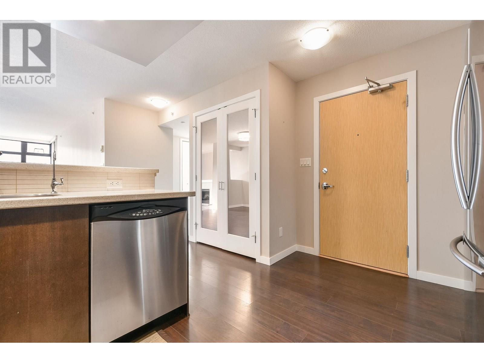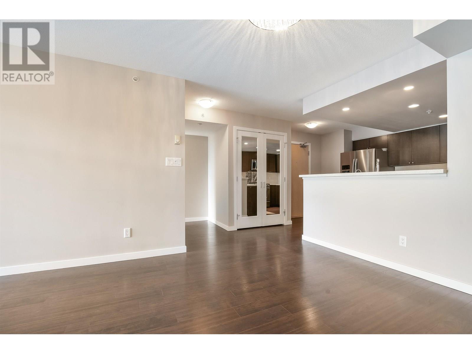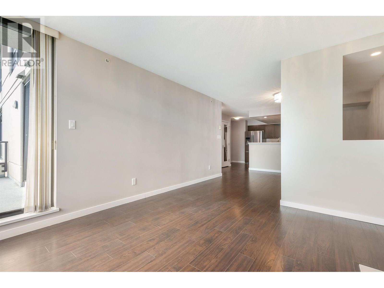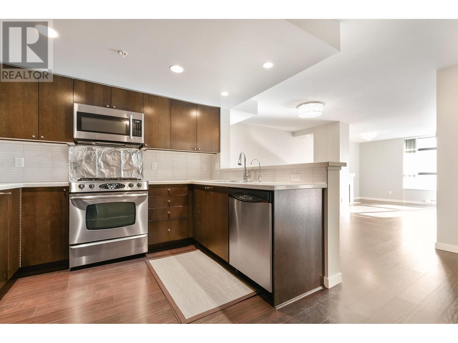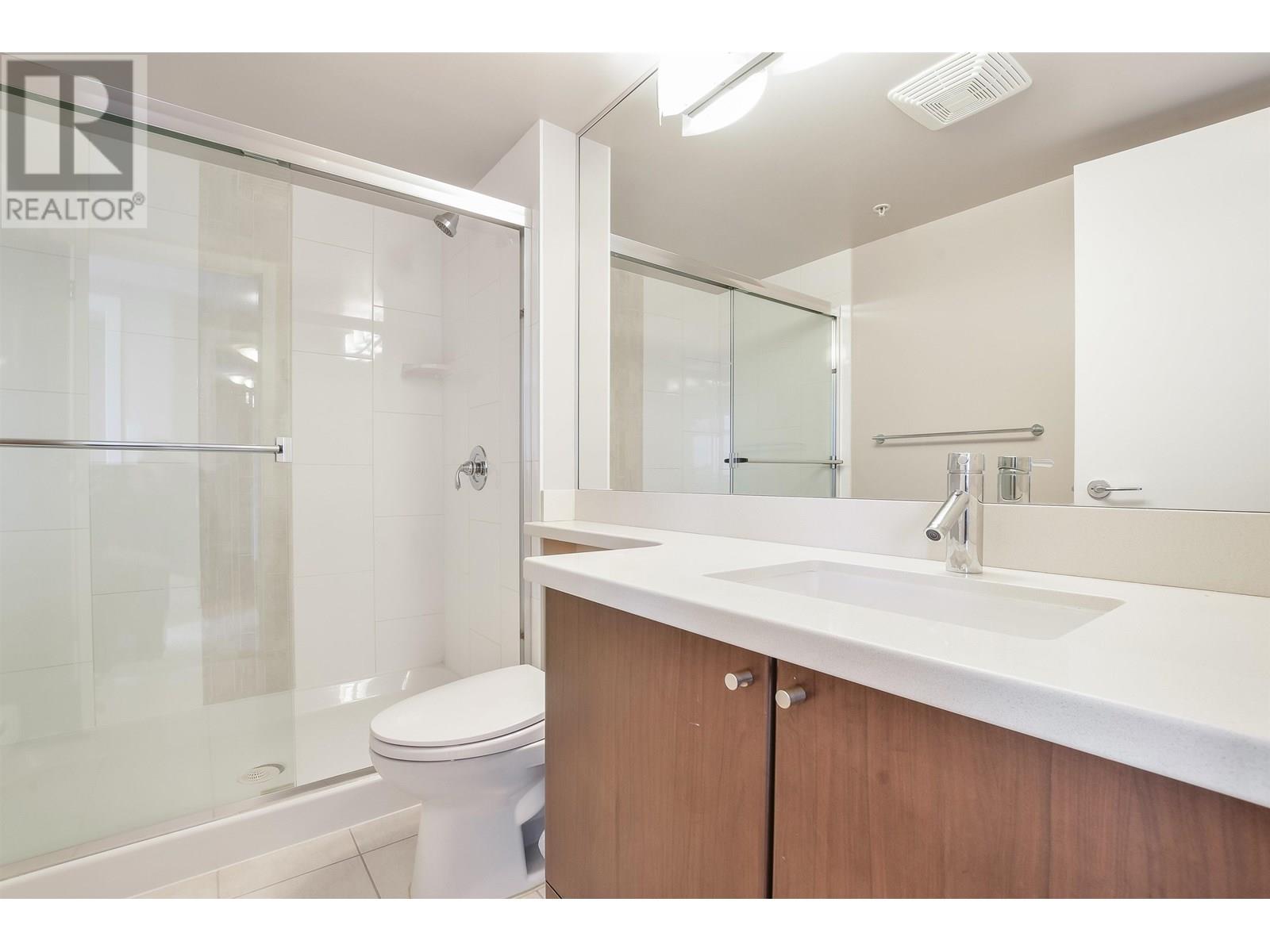 Spacious 1017sf 2-bedroom, 2-bathroom condo with upgraded engineered wood floors and a large rectangular balcony offering North Shore mountain views. The living room features an electric fireplace, grand ceiling light, and balcony access. Adjacent dining area has a modern light fixture and semi-partition wall. The gourmet kitchen includes stainless steel appliances with gas range, stone countertops, tiled backsplash, and three sides of veneer cabinetry. The primary bedroom offers a ceiling fan and a 3-piece ensuite with walk-in shower, stone vanity, and full-height mirror. The second bedroom also opens to the balcony. The main 4-piece bathroom includes an extended vanity and soaker tub. Rent includes one parking stall and a storage locker. (id:48970) Show More