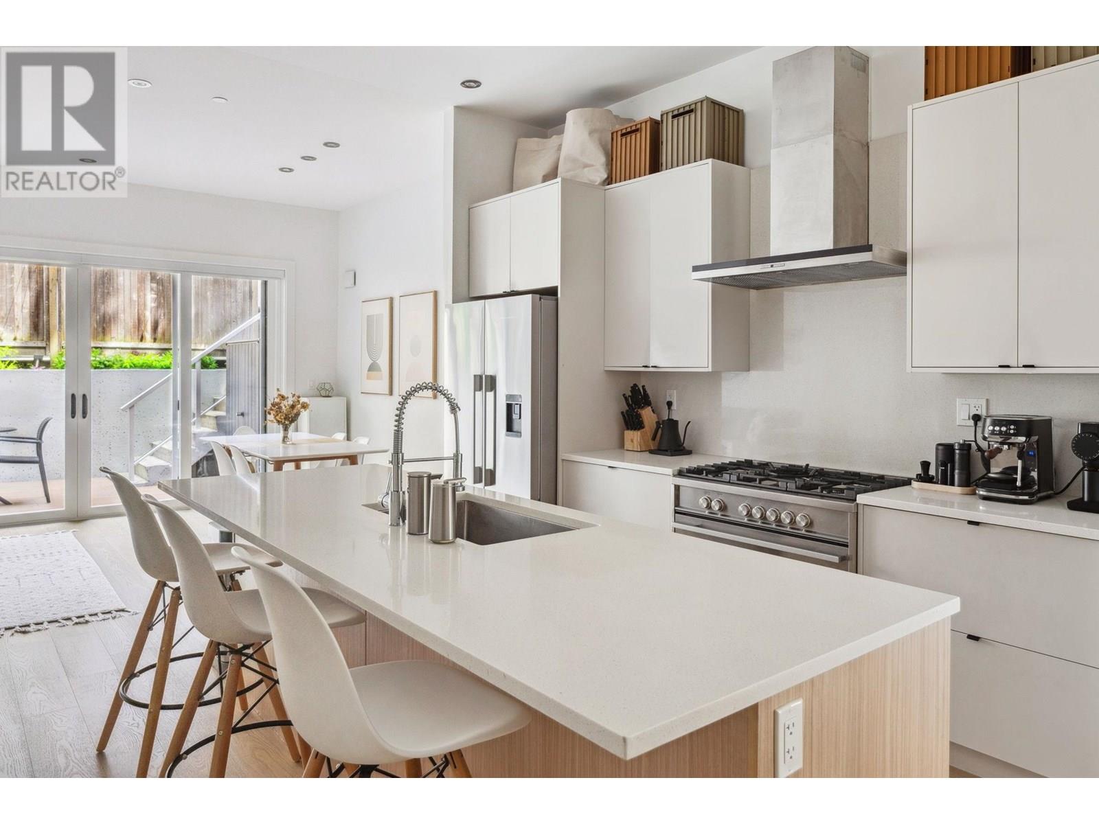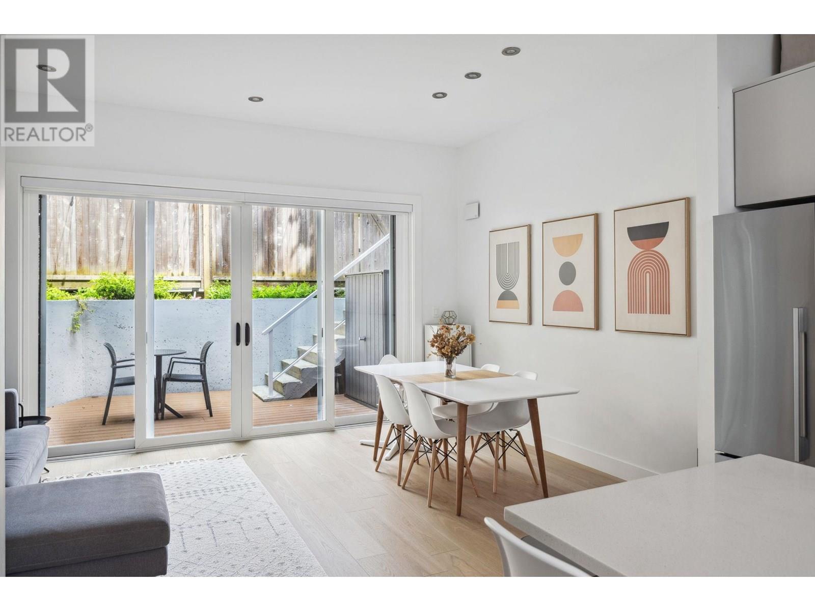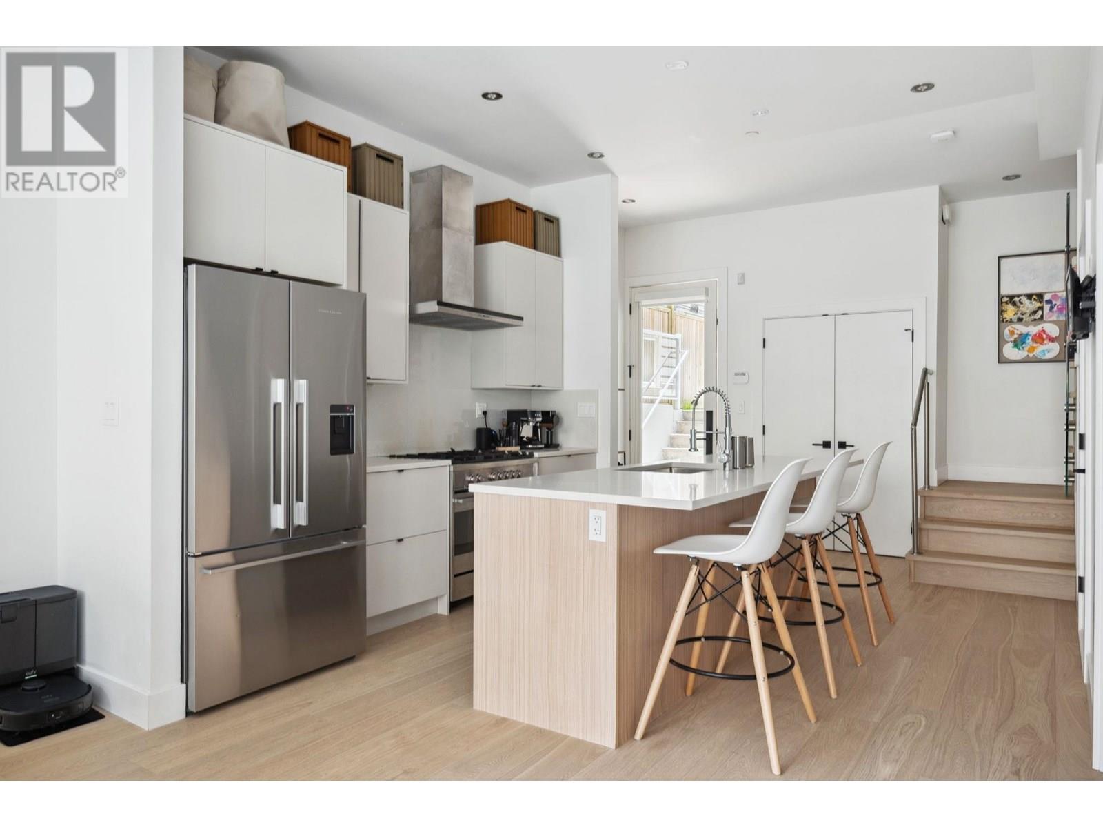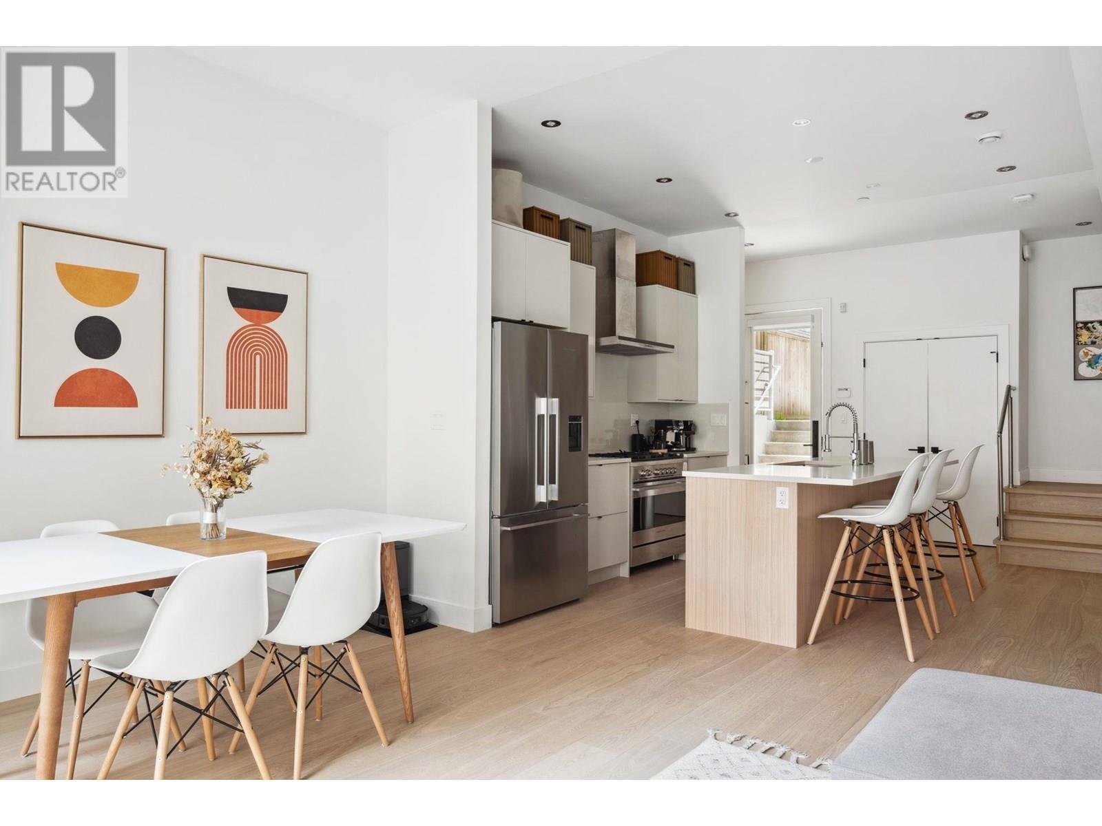 Beautifully designed back half-duplex that combines privacy & tranquility in a prime location; just 1 block from Commercial Dr! This thoughtfully designed home features a well-laid-out floor plan with soaring 10ft ceilings on the main. Upstairs, spacious primary bedroom with walk-in closet and ensuite bathroom, along with second bedroom and full bathroom. Top floor is perfect for home office, family room, or 3rd bedroom and opens to an amazing rooftop terrace-great for summer entertaining! High-end features include hardwood floor, radiant in-floor heating, double blackout blinds in bedrooms, on-demand hot water. Kitchen boasts a large island and full-size appliances, including a five-burner gas cooktop. Xtra: BBQ gas hookup & motorized gate. OH Sat and Sun July 12 &13, 2pm to 4pm. (id:48970) Show More