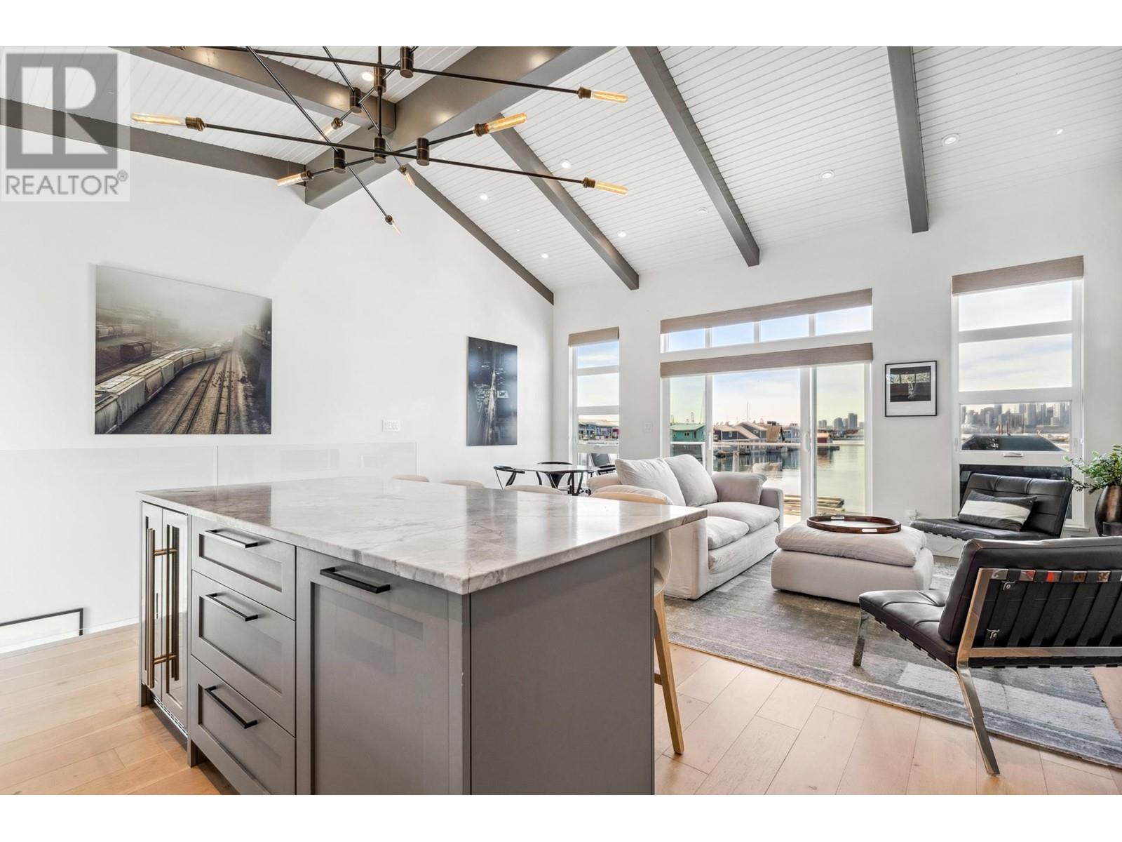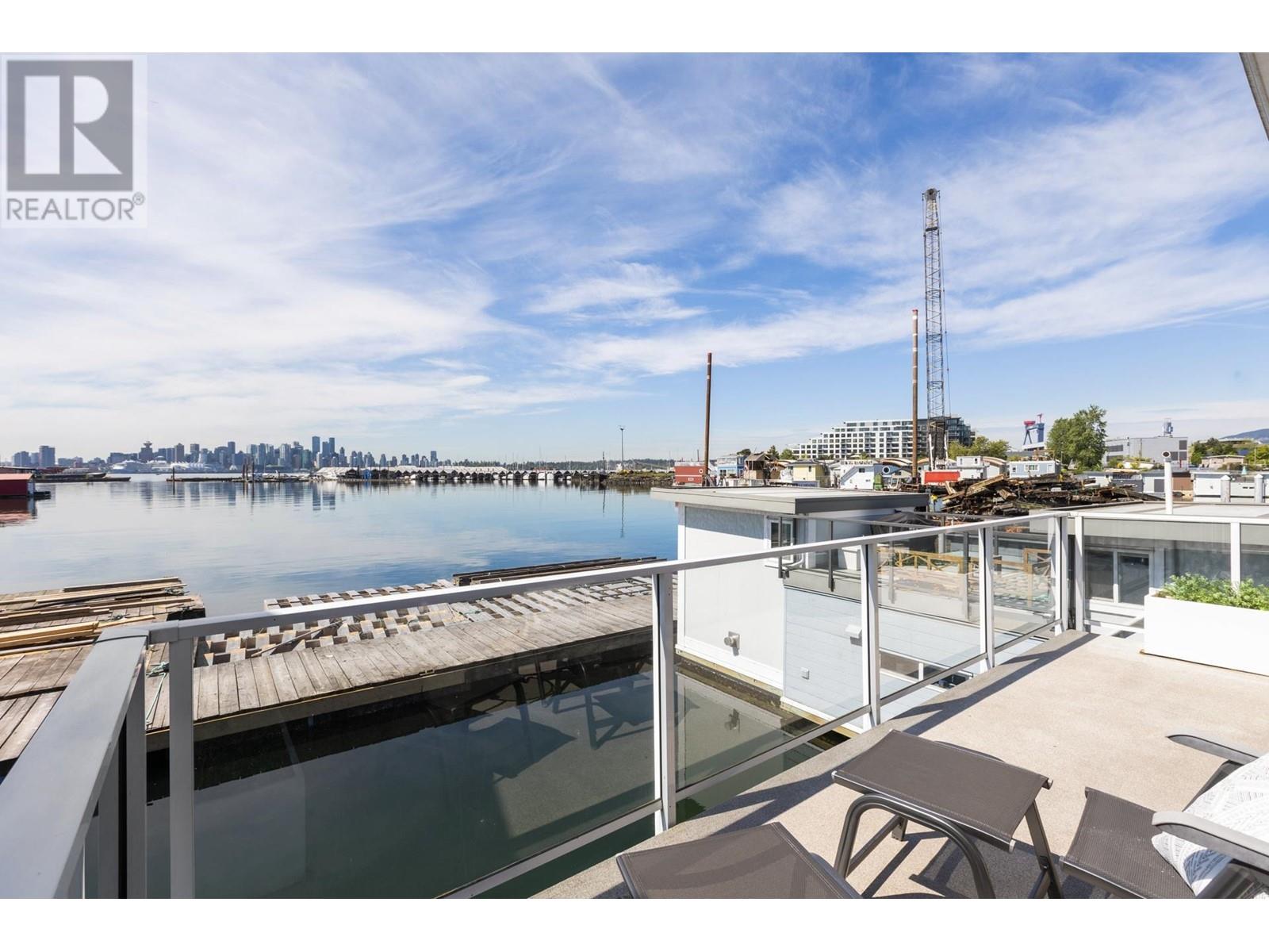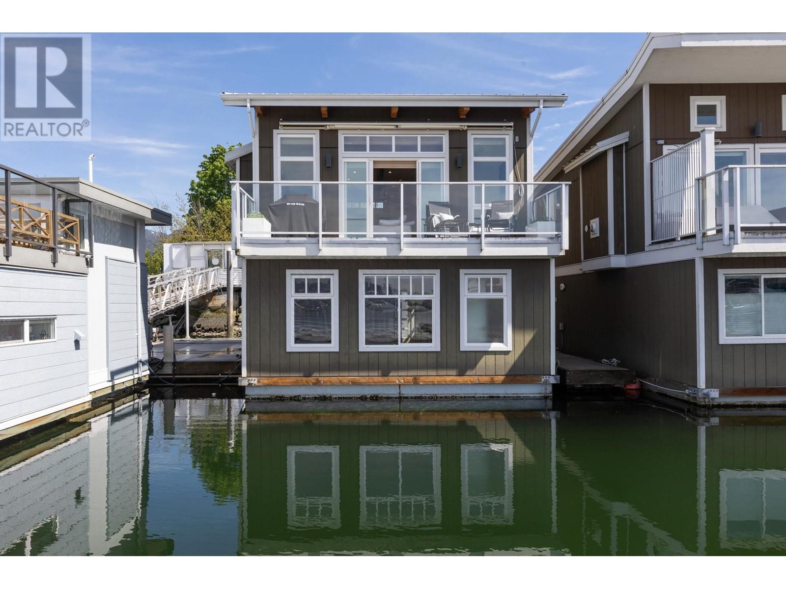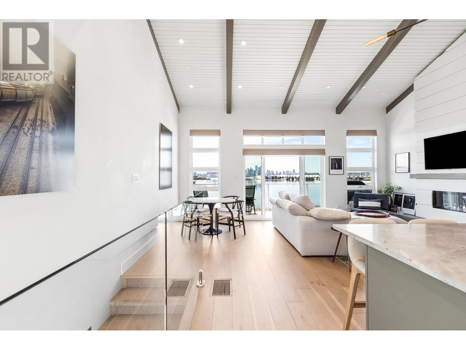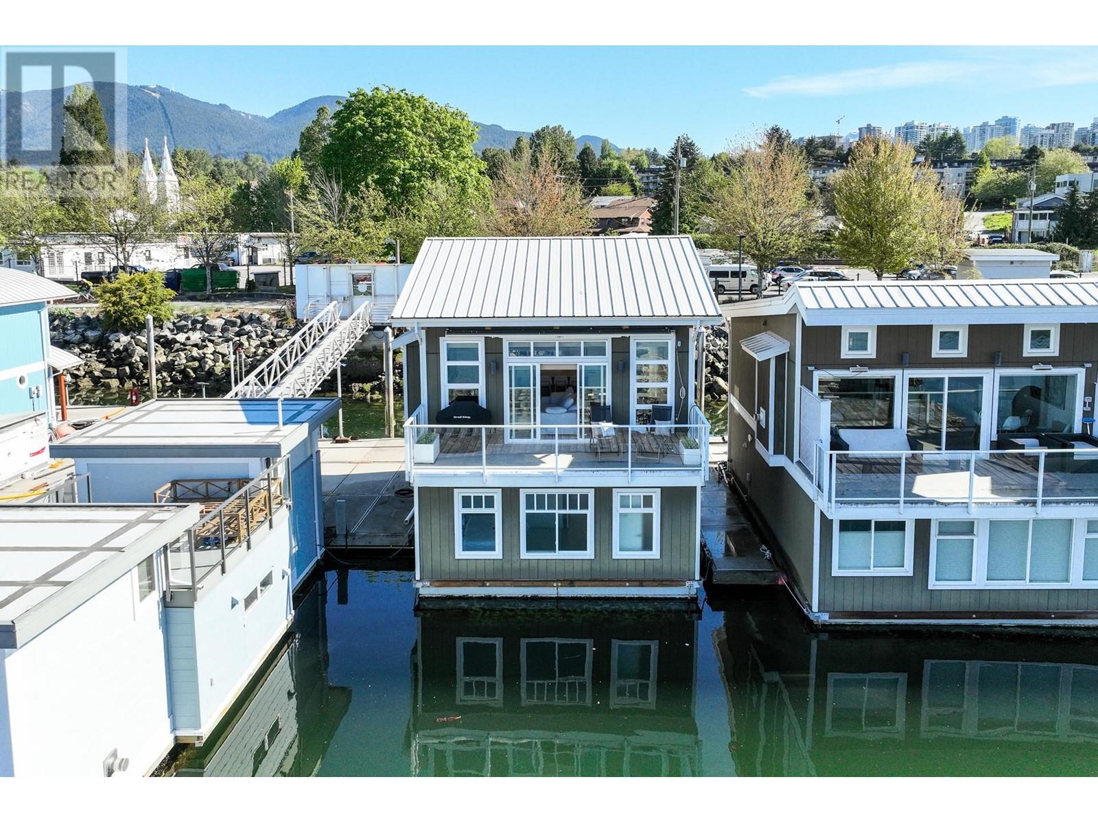 Live on the water in this renovated 2-bed, 2-bath, 1,182 sq/ft float home at Mosquito Creek Marina. With rare north-south exposure and stunning views of the water and downtown, this home offers natural light & modern elegance. The reverse floor plan maximizes the view, with an open-concept main level featuring white oak floors, custom millwork, a gas ffp, vaulted ceilings, and a chef´s kitchen with large island. Sliding doors open to a 151 sq/ft deck with awning-ideal for relaxing or entertaining. Downstairs: two bedrooms, including a spacious primary with ensuite, plus a spa-like steam shower and in-unit laundry. Built with 2x6 construction, metal roof, and on-demand hot water. Airbnb/rentals allowed with yearly fee. Moorage: $1,130/m. Steps to Spirit Trail, Shipyards, and Lonsdale Quay. (id:48970) Show More