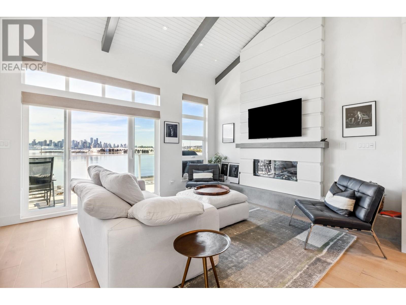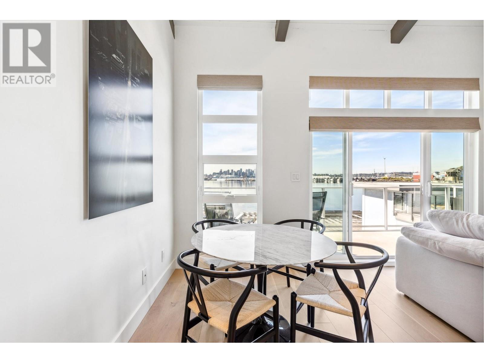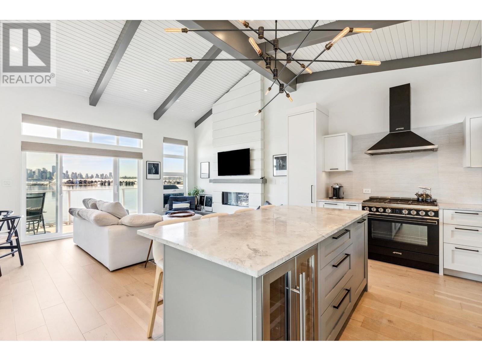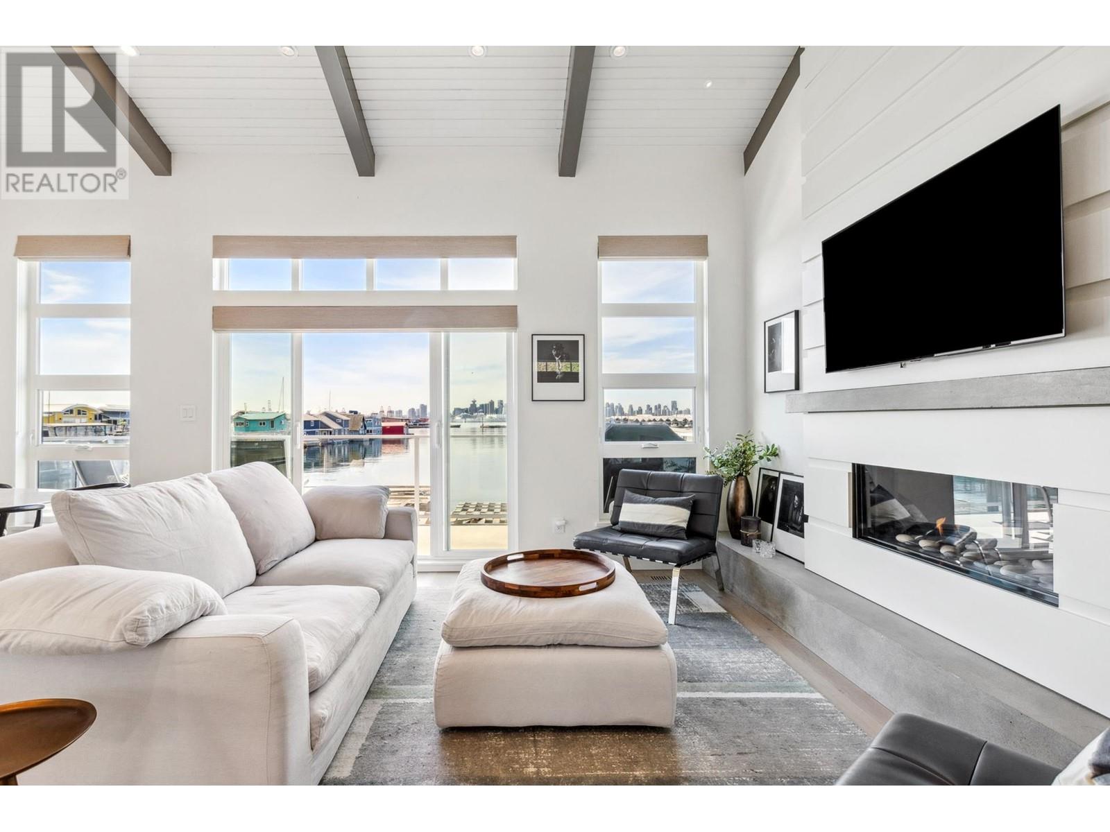 Live on the water in this renovated 2-bed, 2-bath, 1,182 sq/ft float home at Mosquito Creek Marina. With rare north-south exposure and stunning views of the water and downtown, this home offers natural light & modern elegance. The reverse floor plan maximizes the view, with an open-concept main level featuring white oak floors, custom millwork, a gas ffp, vaulted ceilings, and a chef´s kitchen with large island. Sliding doors open to a 151 sq/ft deck with awning-ideal for relaxing or entertaining. Downstairs: two bedrooms, including a spacious primary with ensuite, plus a spa-like steam shower and in-unit laundry. Built with 2x6 construction, metal roof, and on-demand hot water. Airbnb/rentals allowed with yearly fee. Moorage: $1,130/m. Steps to Spirit Trail, Shipyards, and Lonsdale Quay. (id:48970) Show More