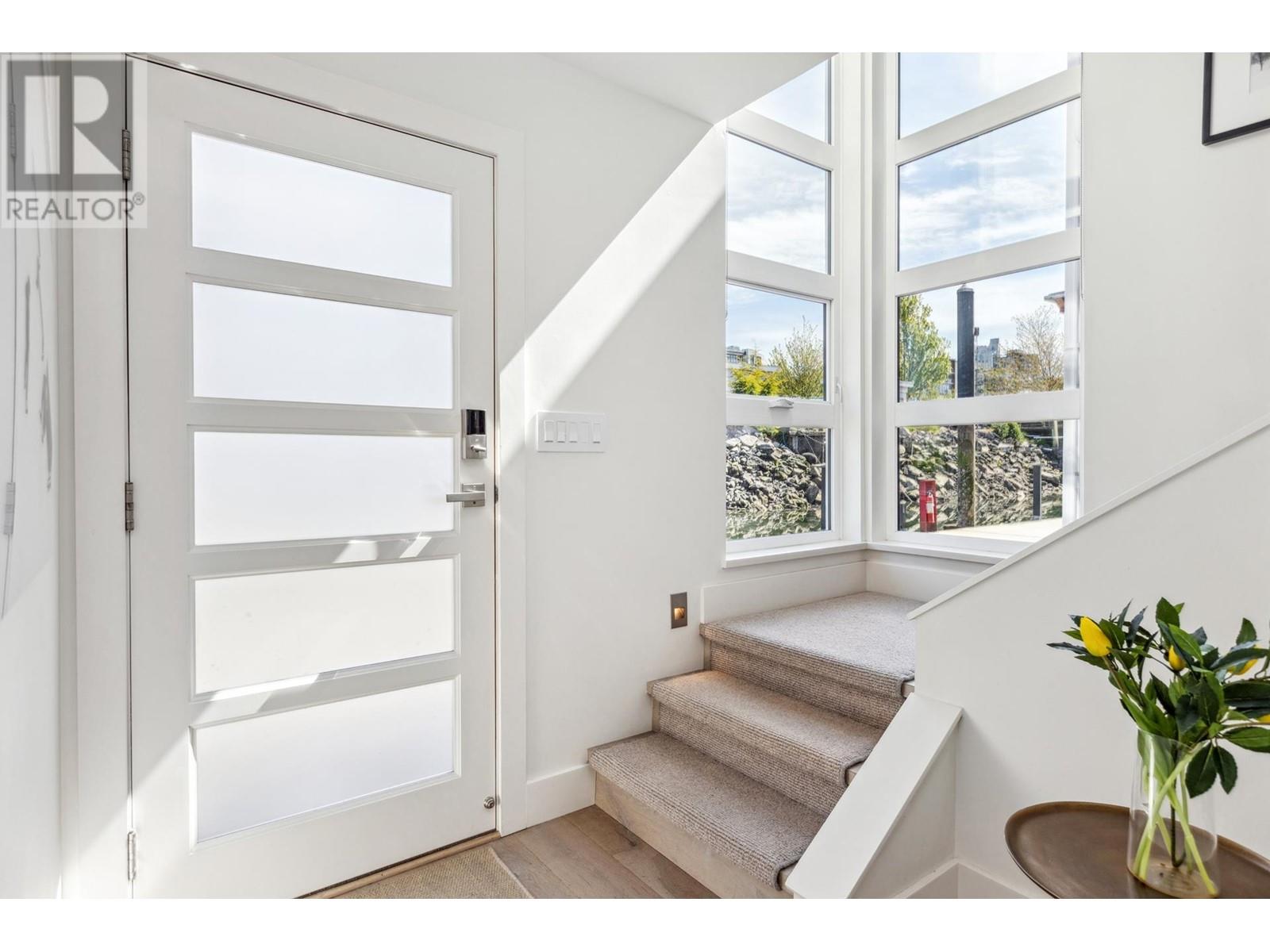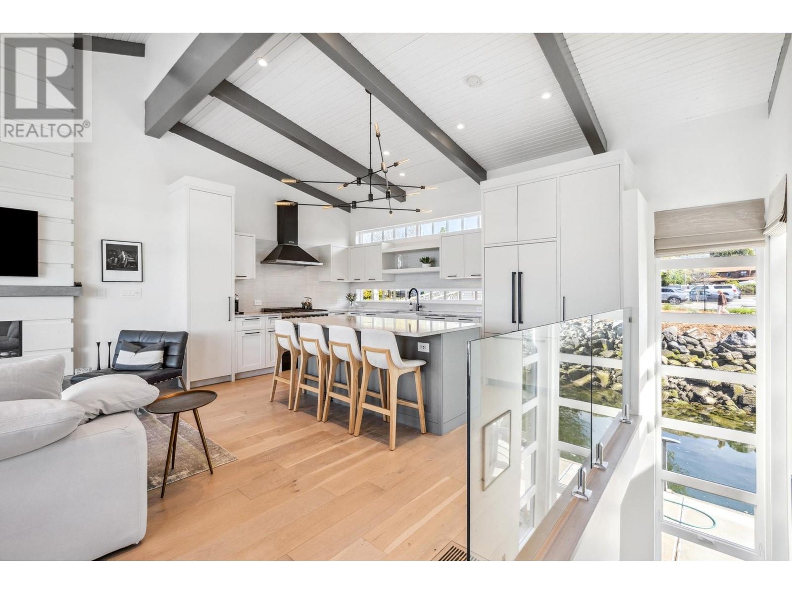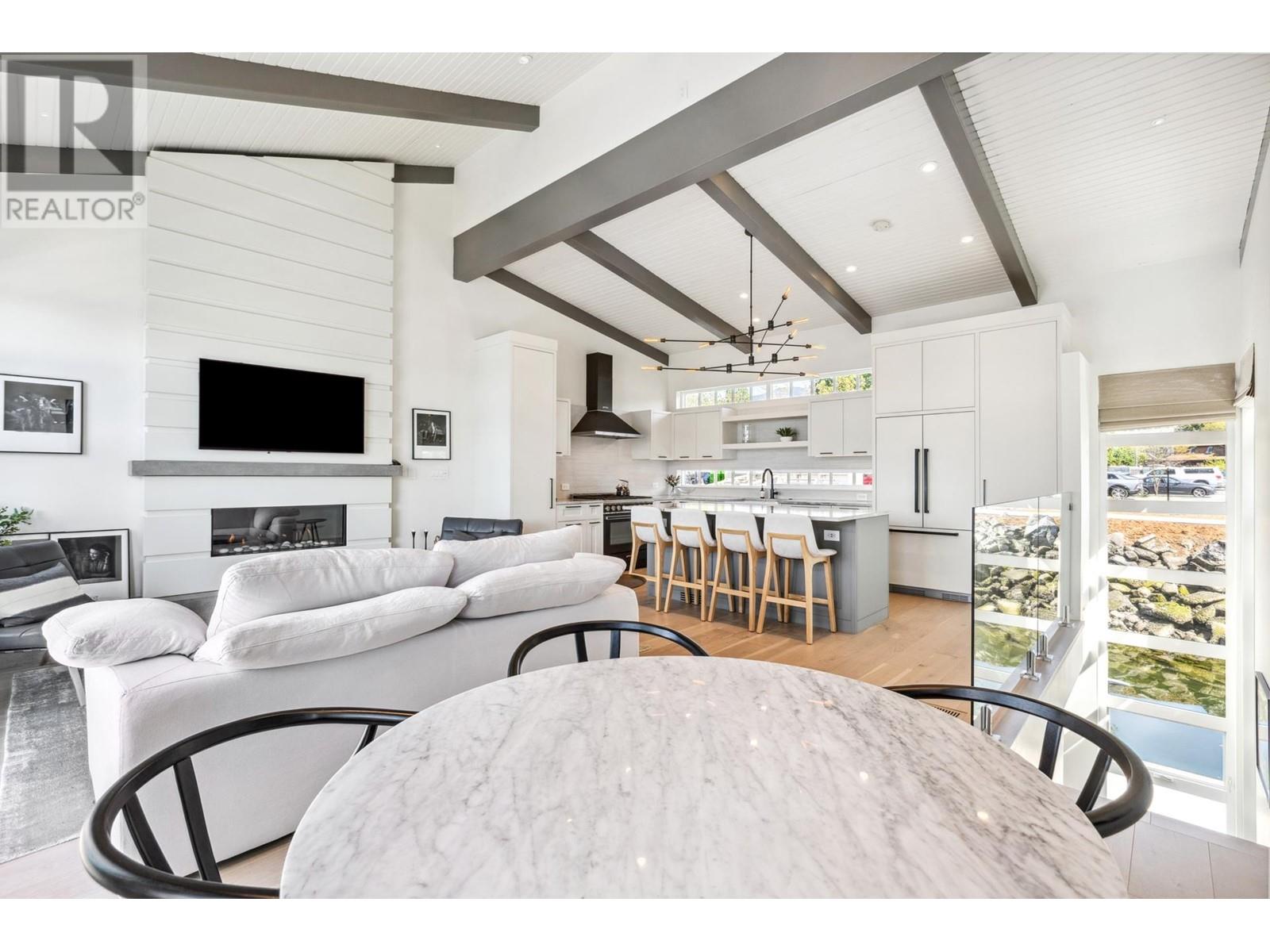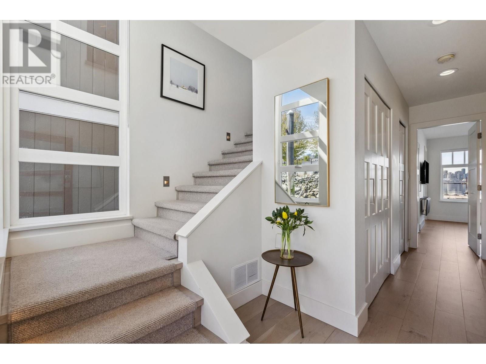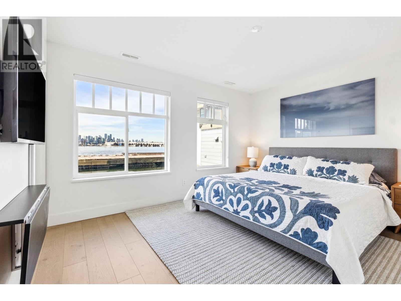 Live on the water in this renovated 2-bed, 2-bath, 1,182 sq/ft float home at Mosquito Creek Marina. With rare north-south exposure and stunning views of the water and downtown, this home offers natural light & modern elegance. The reverse floor plan maximizes the view, with an open-concept main level featuring white oak floors, custom millwork, a gas ffp, vaulted ceilings, and a chef´s kitchen with large island. Sliding doors open to a 151 sq/ft deck with awning-ideal for relaxing or entertaining. Downstairs: two bedrooms, including a spacious primary with ensuite, plus a spa-like steam shower and in-unit laundry. Built with 2x6 construction, metal roof, and on-demand hot water. Airbnb/rentals allowed with yearly fee. Moorage: $1,130/m. Steps to Spirit Trail, Shipyards, and Lonsdale Quay. (id:48970) Show More