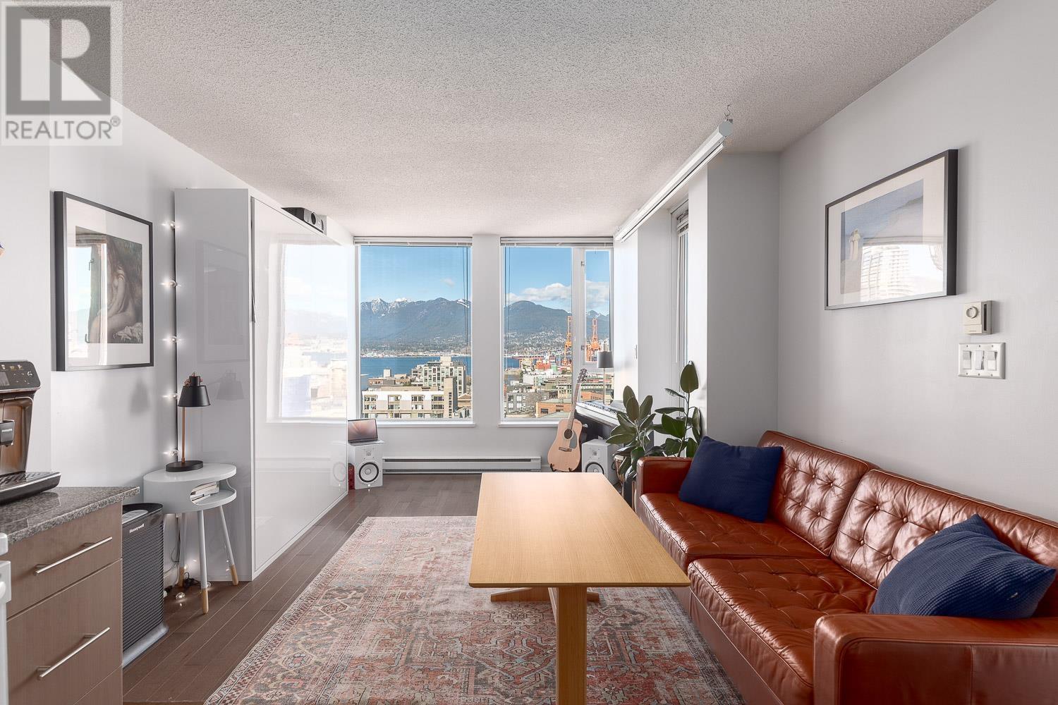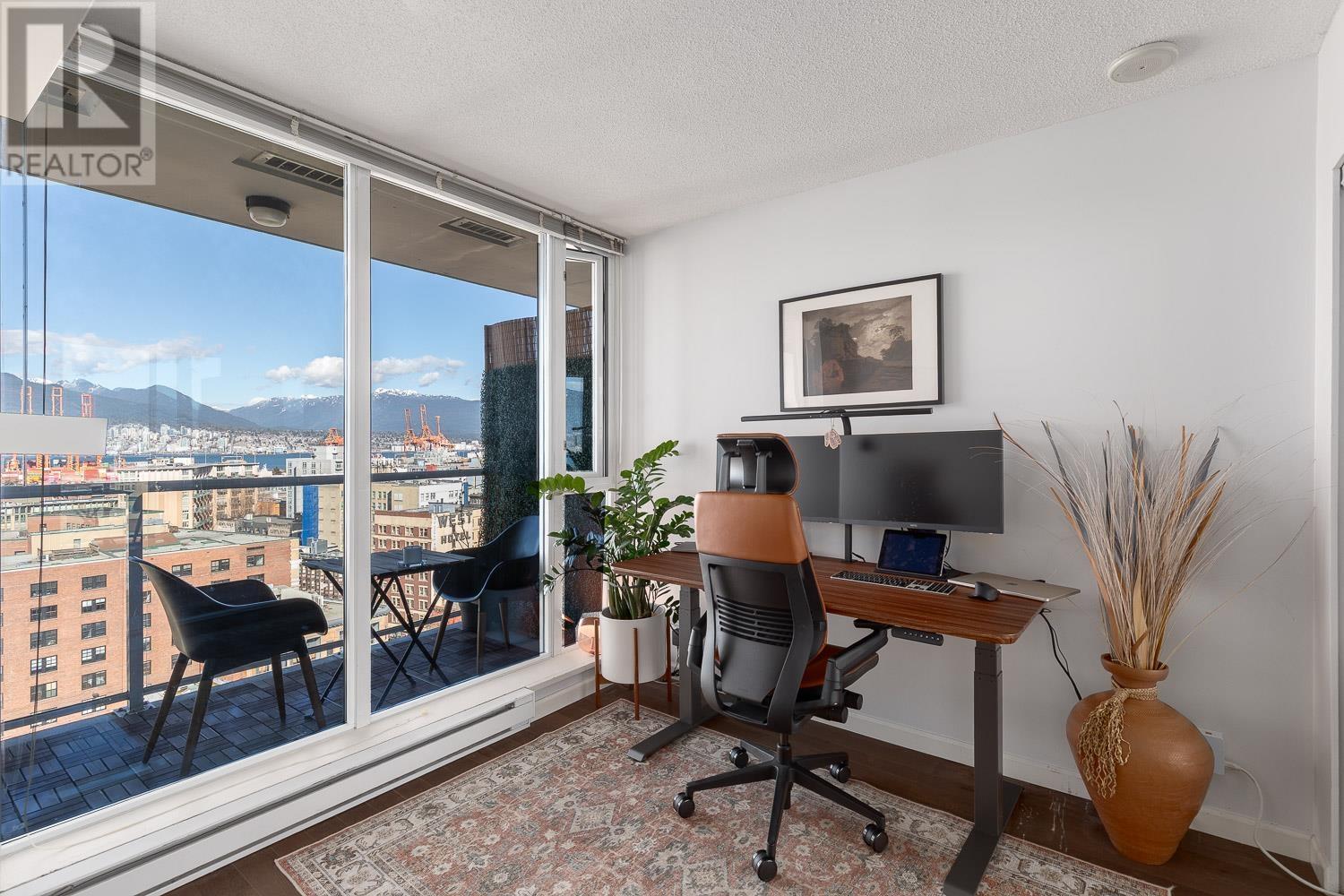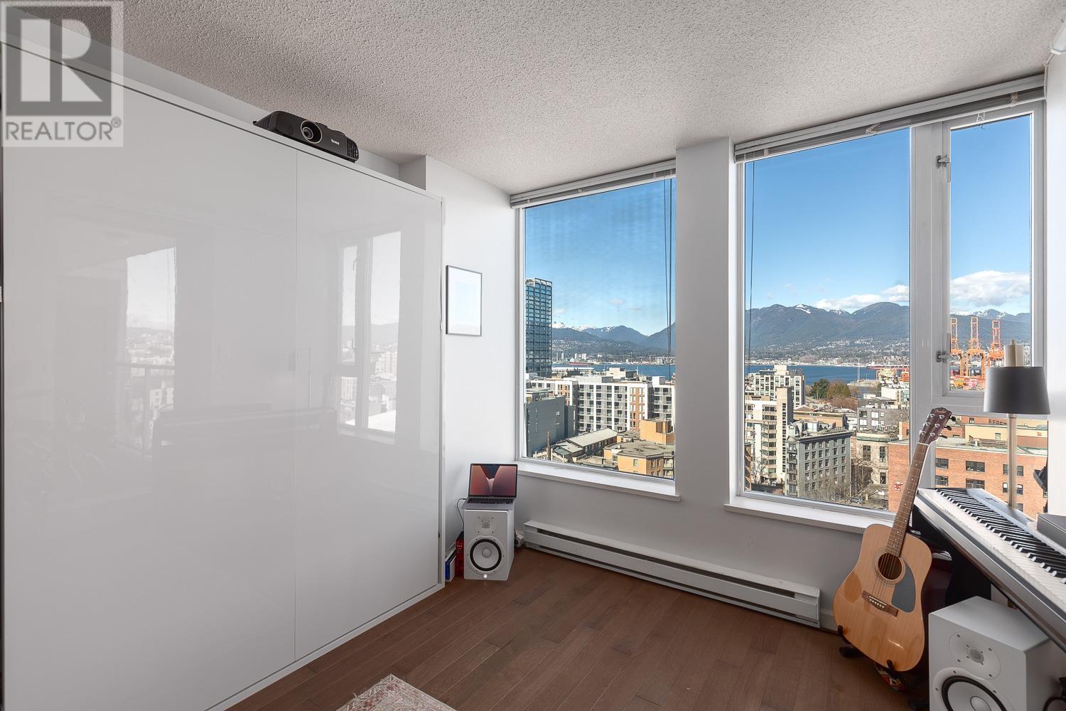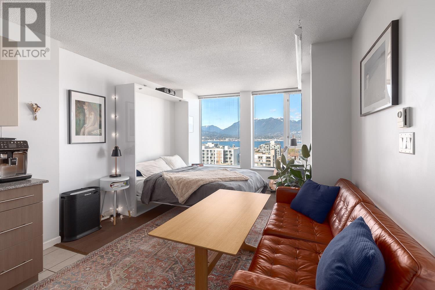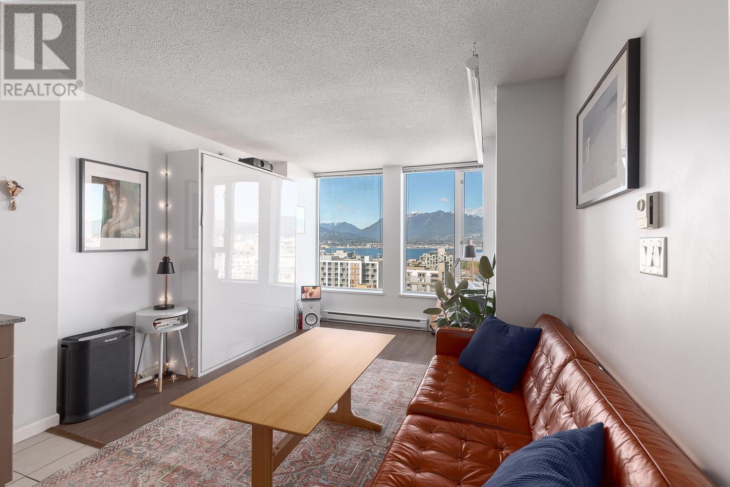 1 BEDROOM + LARGE DEN + BALCONY with stunning, unobstructed MOUNTAIN, OCEAN & CITY VIEWS-experience a new, breathtaking scene every day. FLOOR-TO-CEILING windows flood the space with natural light. The living area includes a sleek Murphy bed with a hydraulic lift, converting easily into a queen-size bed. The official bedroom is currently used as an office but fits a standard queen bed if preferred. Includes in-suite laundry, 1 parking, and a storage locker. SUPER CONVENIENT: 5 min walk to the Seawall, SKYTRAIN, Rogers Arena, Concord Park, Costco, T&T, International Village & more. Building offers a GYM, office/lounge, bike & visitor parking, and updated elevators. A rare opportunity-come see the view in person! (id:48970) Show More
