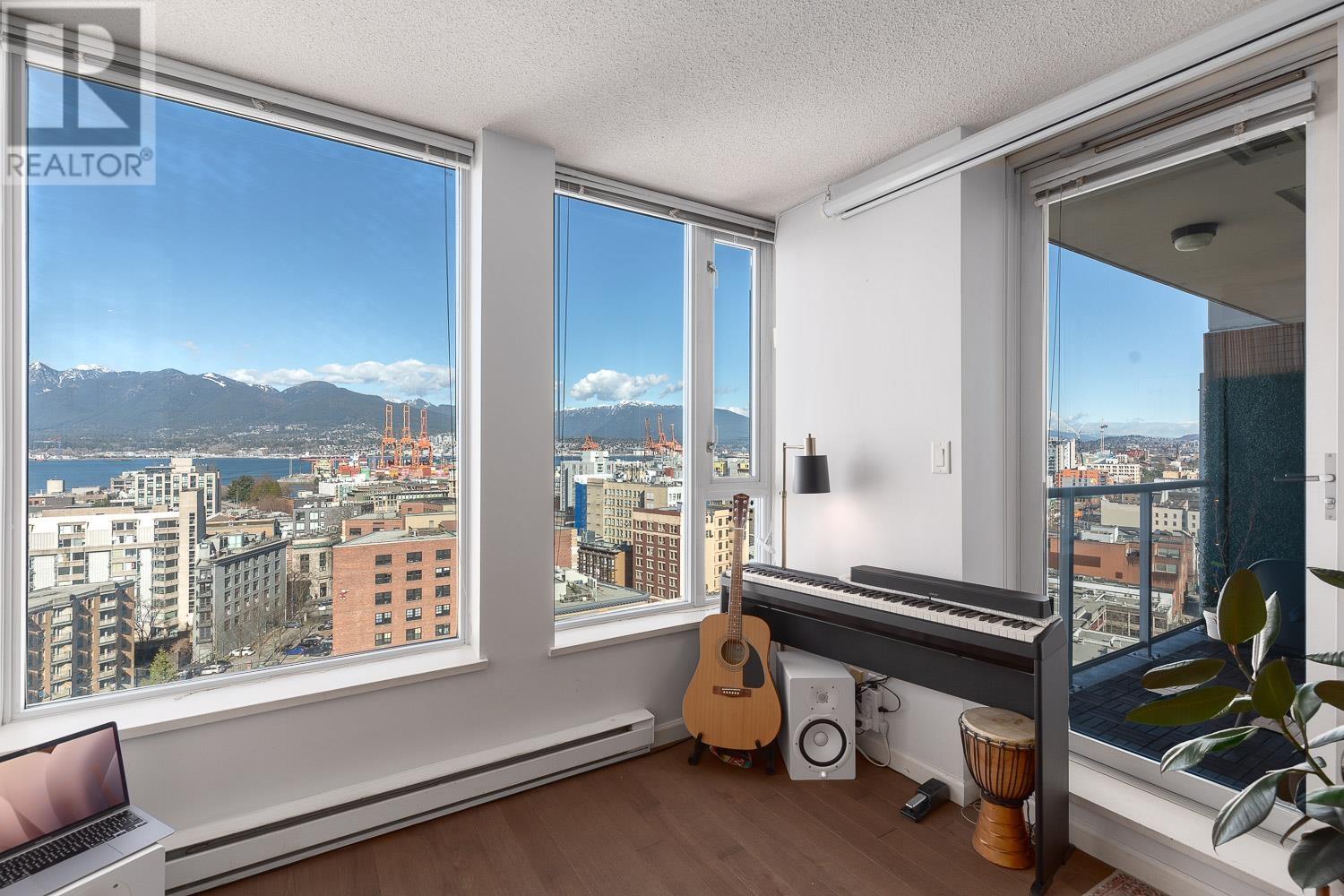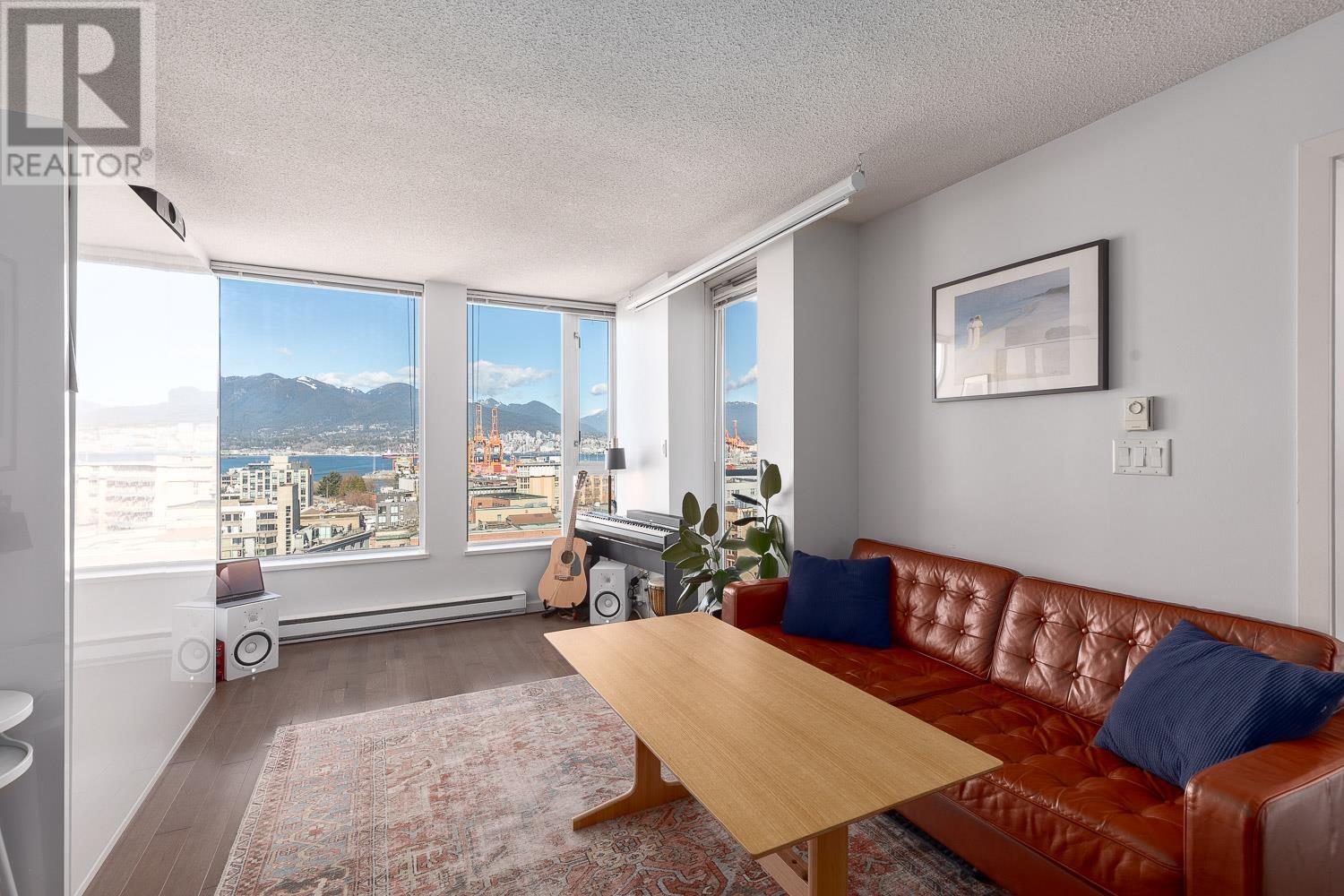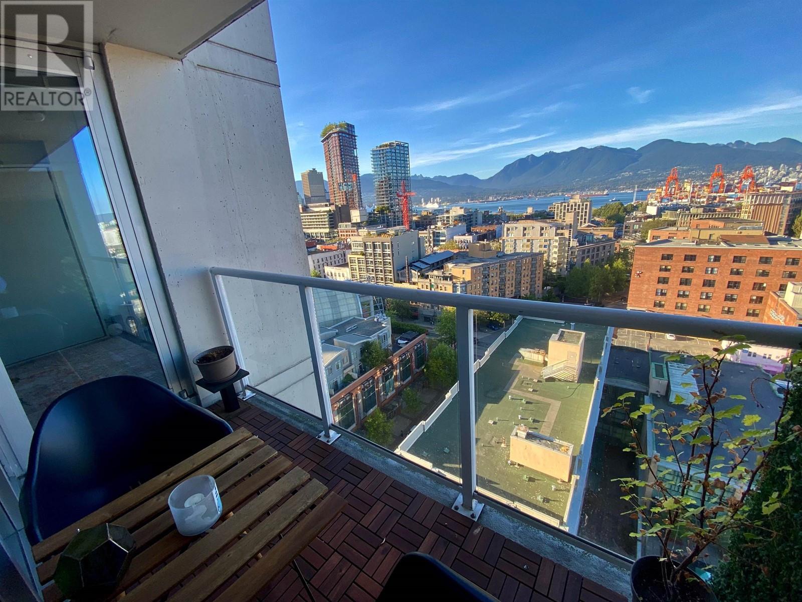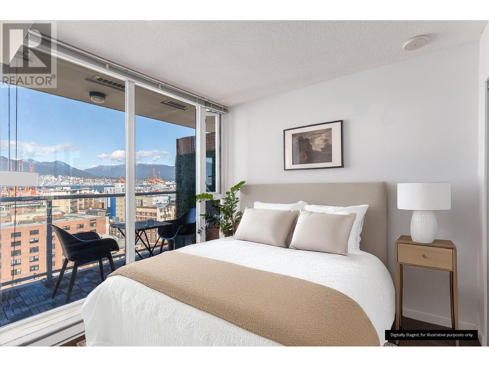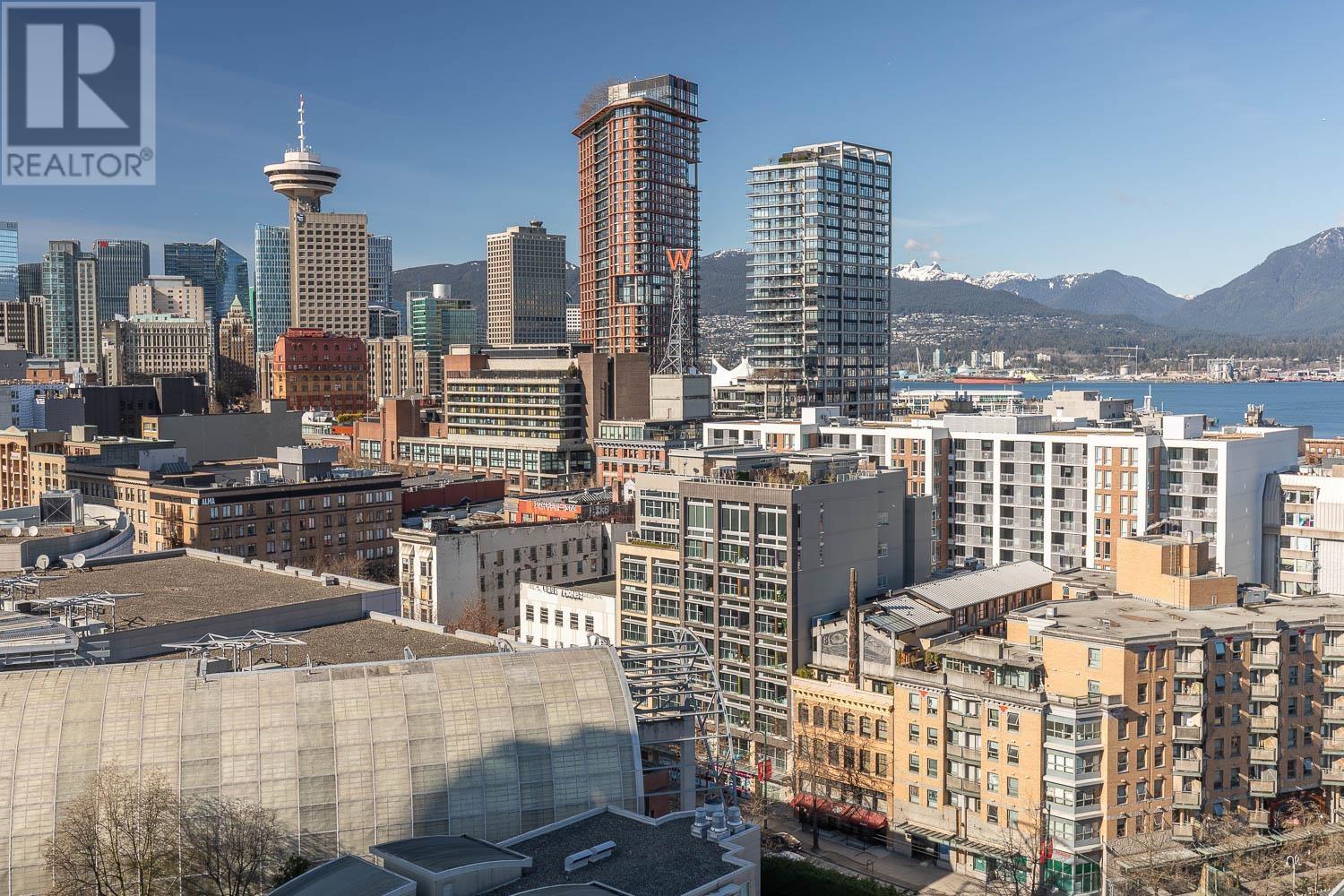 1 BEDROOM + LARGE DEN + BALCONY with stunning, unobstructed MOUNTAIN, OCEAN & CITY VIEWS-experience a new, breathtaking scene every day. FLOOR-TO-CEILING windows flood the space with natural light. The living area includes a sleek Murphy bed with a hydraulic lift, converting easily into a queen-size bed. The official bedroom is currently used as an office but fits a standard queen bed if preferred. Includes in-suite laundry, 1 parking, and a storage locker. SUPER CONVENIENT: 5 min walk to the Seawall, SKYTRAIN, Rogers Arena, Concord Park, Costco, T&T, International Village & more. Building offers a GYM, office/lounge, bike & visitor parking, and updated elevators. A rare opportunity-come see the view in person! (id:48970) Show More