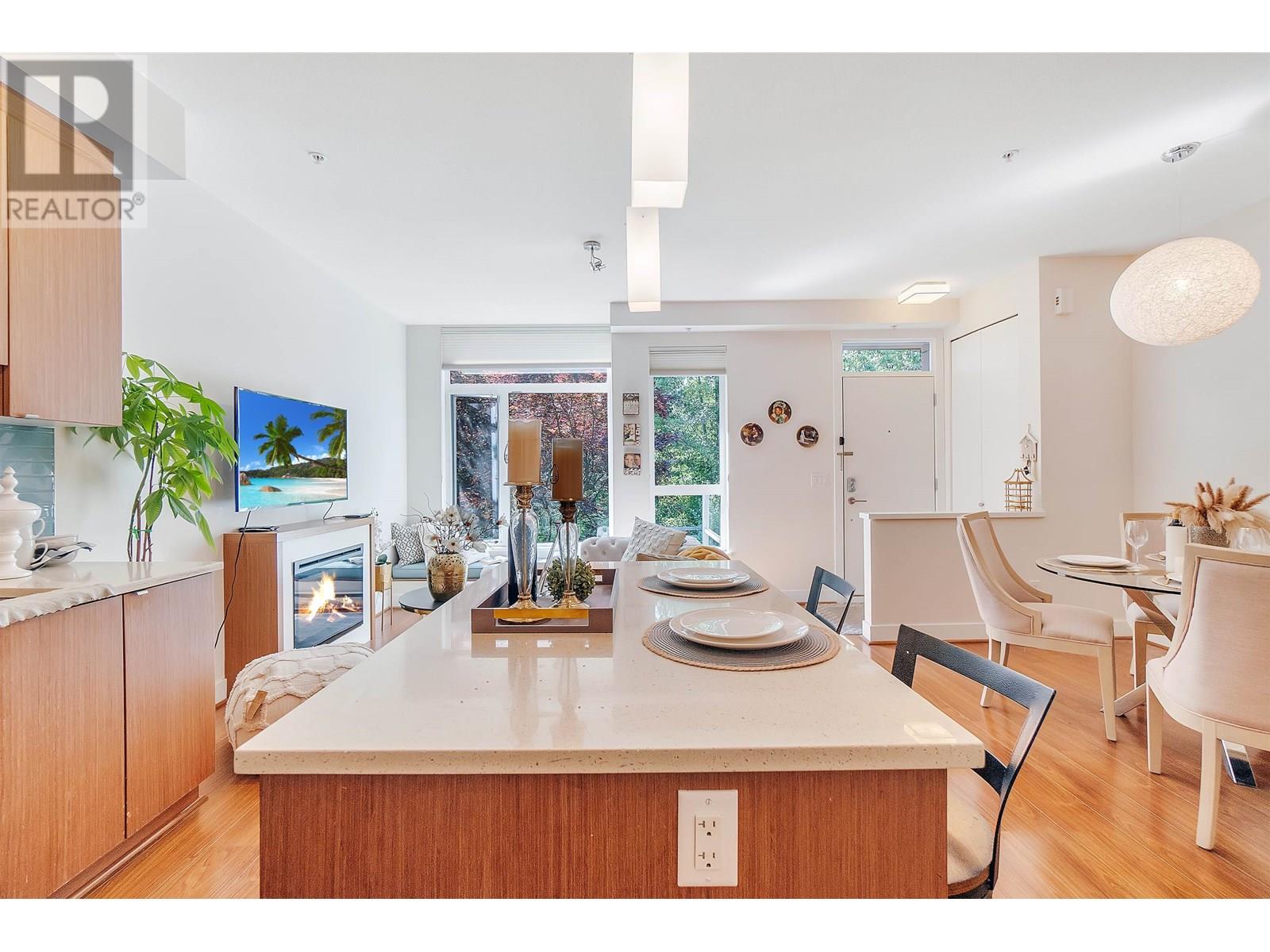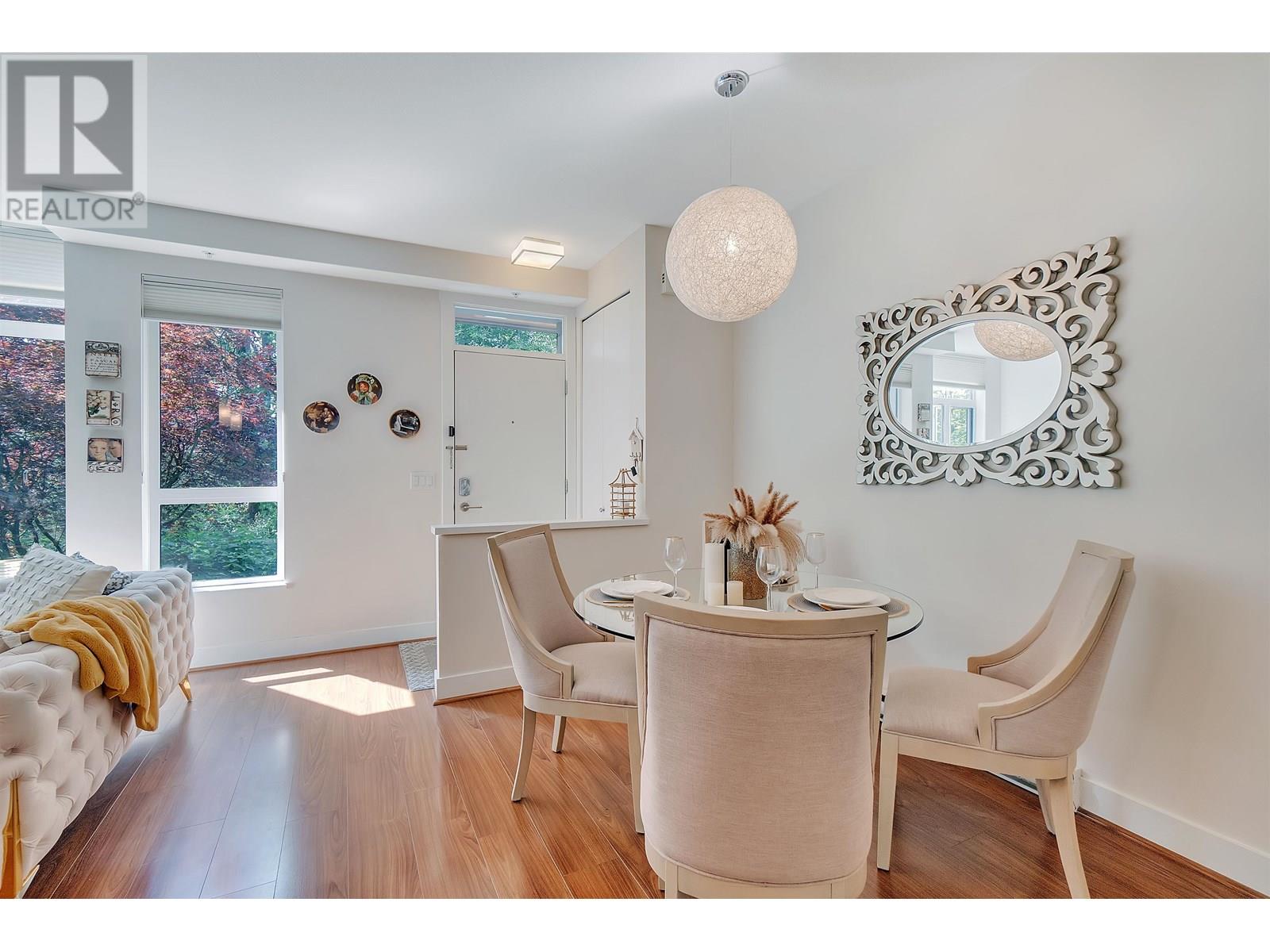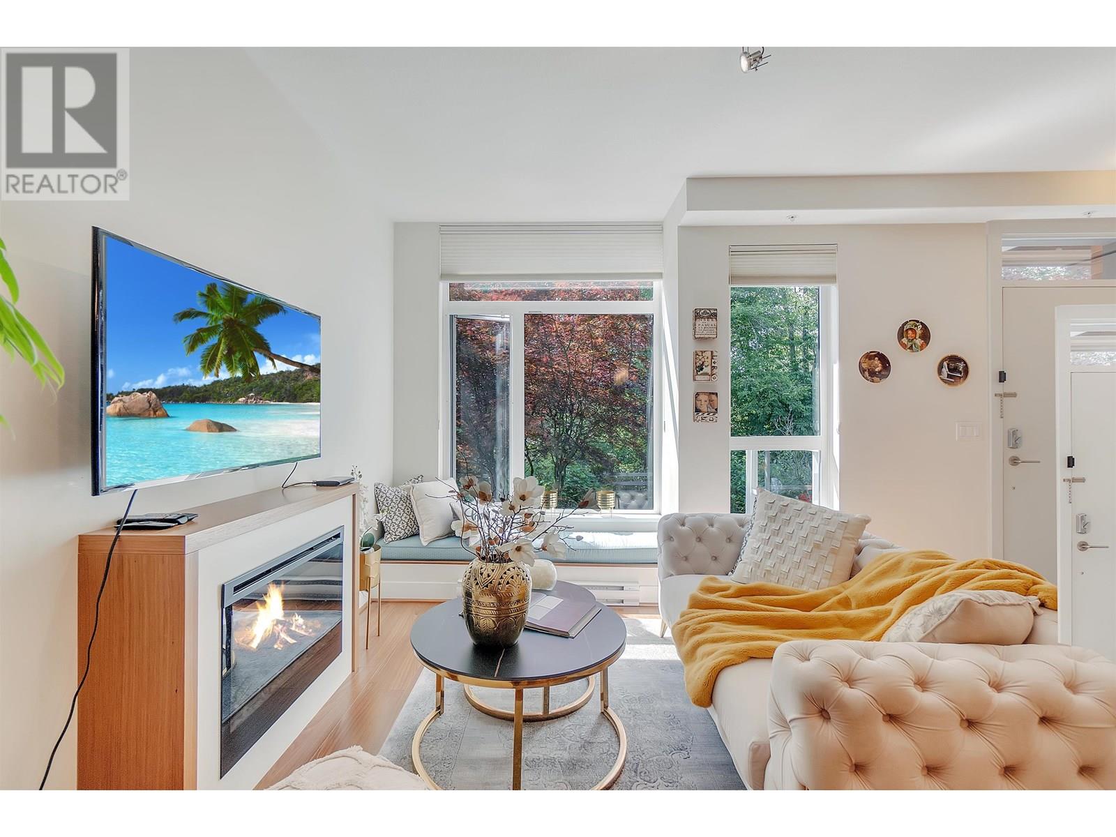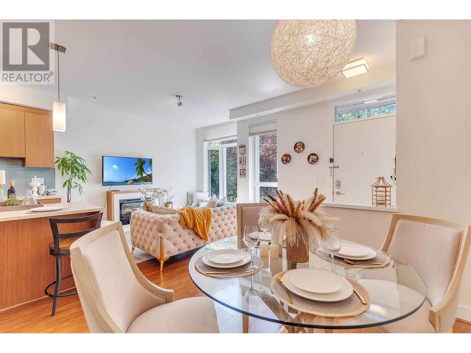 Welcome to Seven35. North Vancouver´s best value green-certified townhome built by award-winning Adera. This 2 bed, 2 bath West Coast Contemporary home features 1,000 square ft of functional living, including a bright open-concept main floor with high ceilings, gourmet kitchen and creative under-stair storage. Upstairs offers two generous bedrooms, including a king-sized primary with walk-in closet and in-suite laundry. The showstopper? A 350 square ft rooftop patio with water/electric hookups, mountain, sunset & downtown views. ideal for a hot tub or entertaining. Located just off Mosquito Creek in a quiet, very private yet steps to trails, shopping, Cap Mall, schools & transit. Includes parking, storage locker, gym, bike room, and playground. Open House July 13 (Sun) 2:00 PM - 4:00 PM (id:48970) Show More