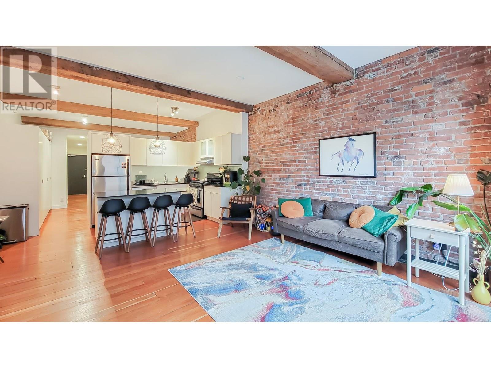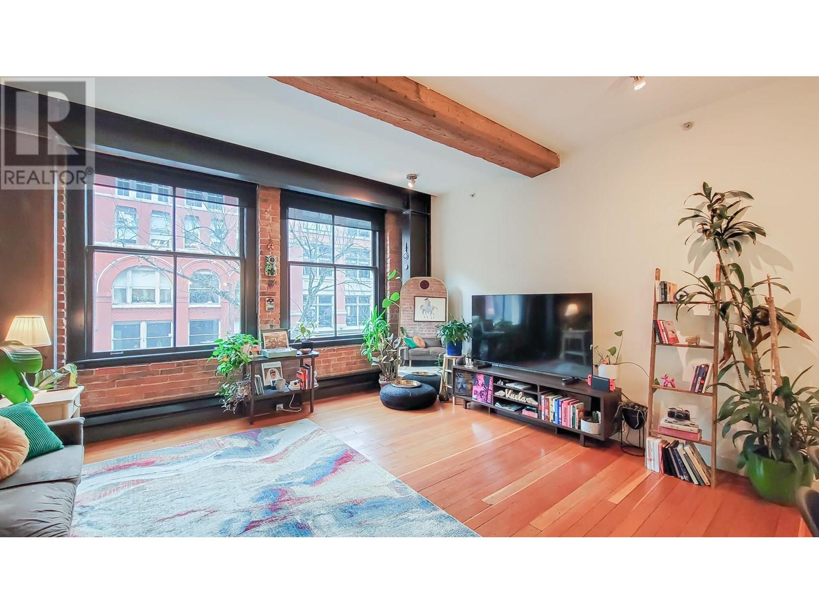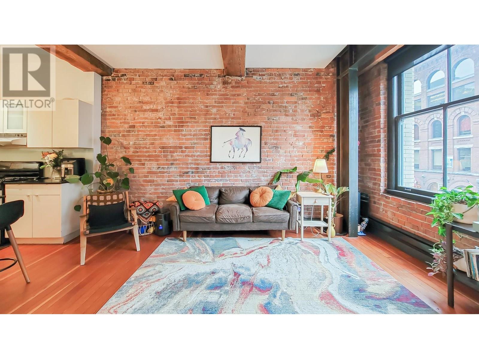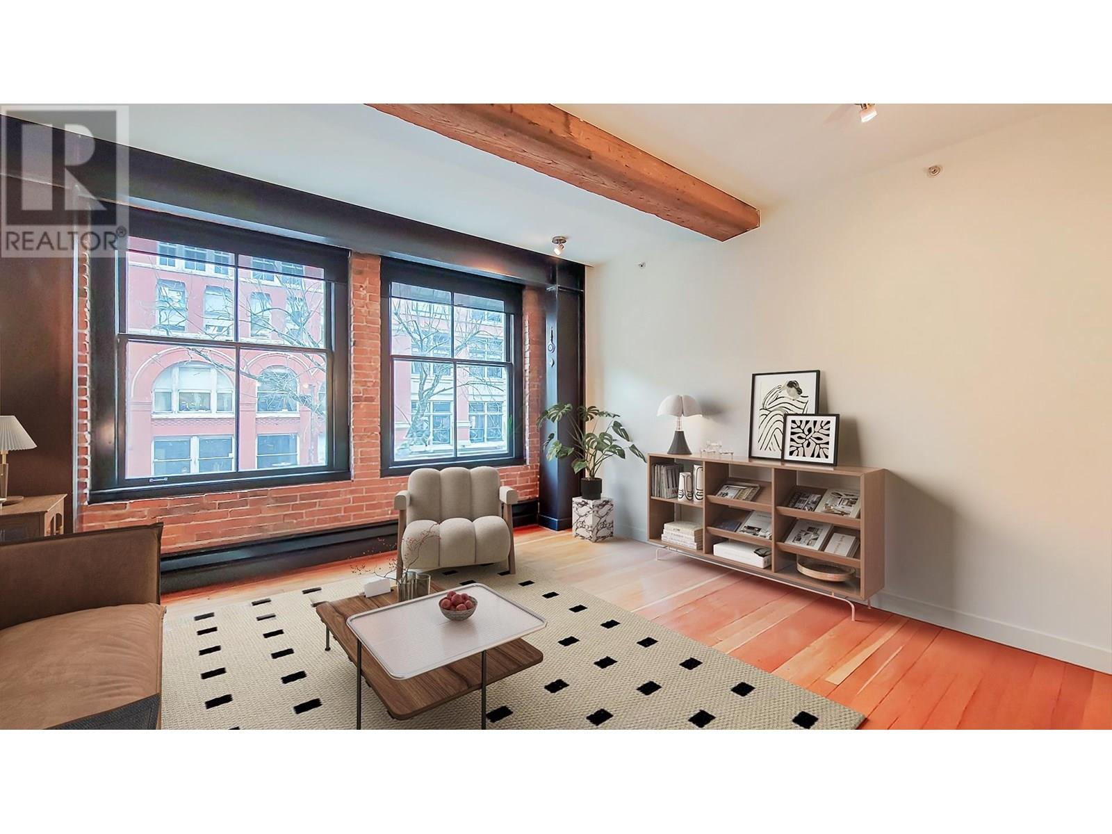 This captivating 812 sqft loft that perfectly blends timeless charm with urban convenience. Featuring original hardwood floors, heritage-style exposed brick walls, and oversized windows that flood the space with natural light, this home is a true gem. Situated directly across from the iconic Steam Clock, this loft offers unparalleled access to all that Gastown has to offer-boutique shopping,restaurants, and the convenience of Waterfront SkyTrain Station, all just steps away. Whether you're looking for a sound investment opportunity or a stunning place to call home, this property checks all the boxes. This is a unique and vibrant piece of Vancouver´s history! 2005 winner of the Award of Excellence for Revitalization. FOUR VIRTUALLY STAGED PICTURE TWO LIVING ROOM AND TWO BEDROOM (id:48970) Show More
