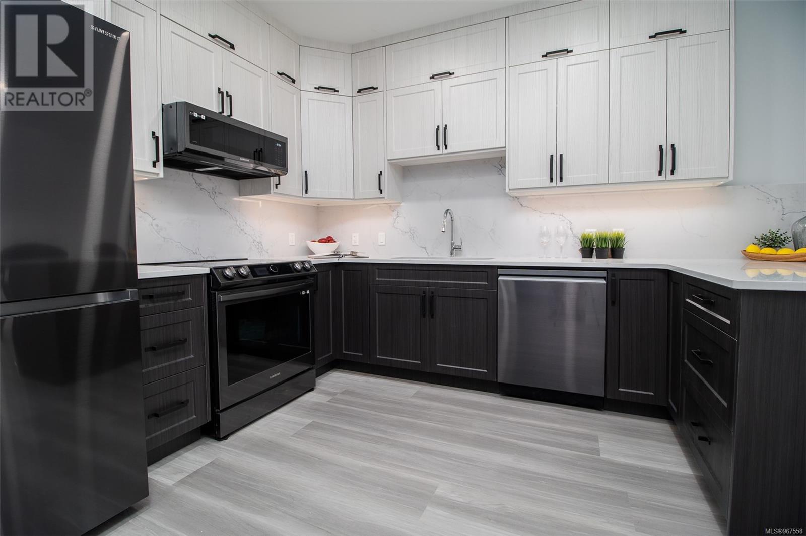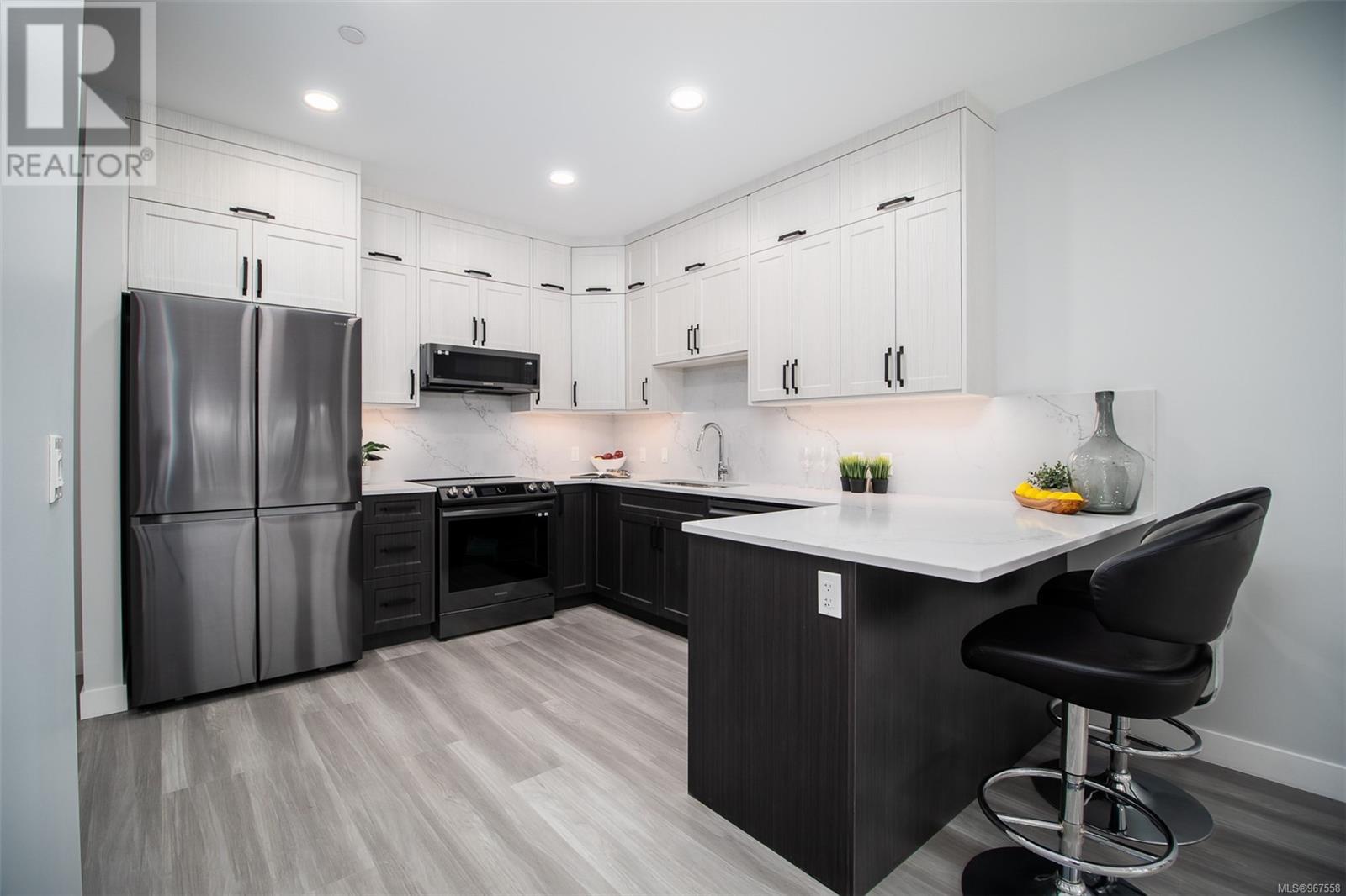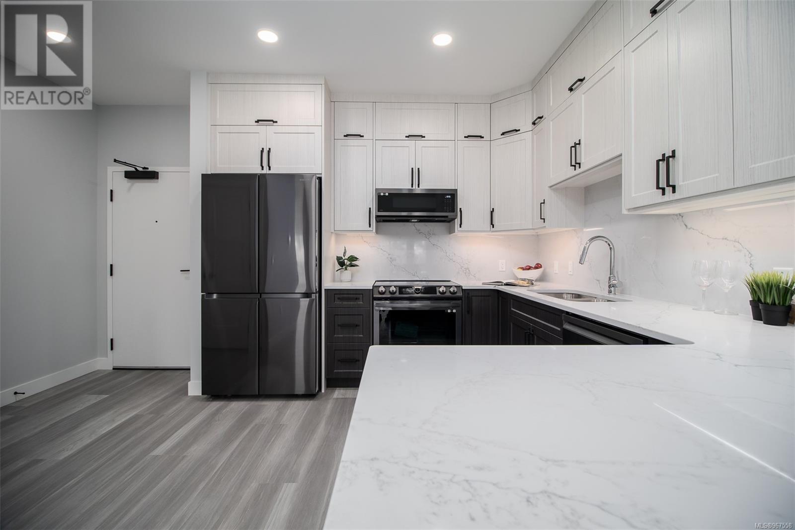 This brand-new two-bedroom, two-bathroom condo offers a unique chance to enjoy close proximity to one of Nanaimo's most sought-after lakes, with stunning lake views. Combining modern living with the charm of nature, creating an ideal balance for those seeking tranquility and convenience in a desirable location. As you step into this modern sanctuary, you are greeted by a naturally lit interior, thanks to expansive windows that fill the space with natural light. The heart of this home features a sleek kitchen equipped with state-of-the-art Samsung appliances, complemented by elegant quartz countertops and a matching quartz backsplash, blending functionality with style. This exceptional residence is conveniently located, offering easy access to shopping and various amenities, ensuring that comfort and convenience are always within reach. 1 underground parking stall incl with each unit. Pictures may not reflect the exact floorplan of the listed unit. (id:48970) Show More