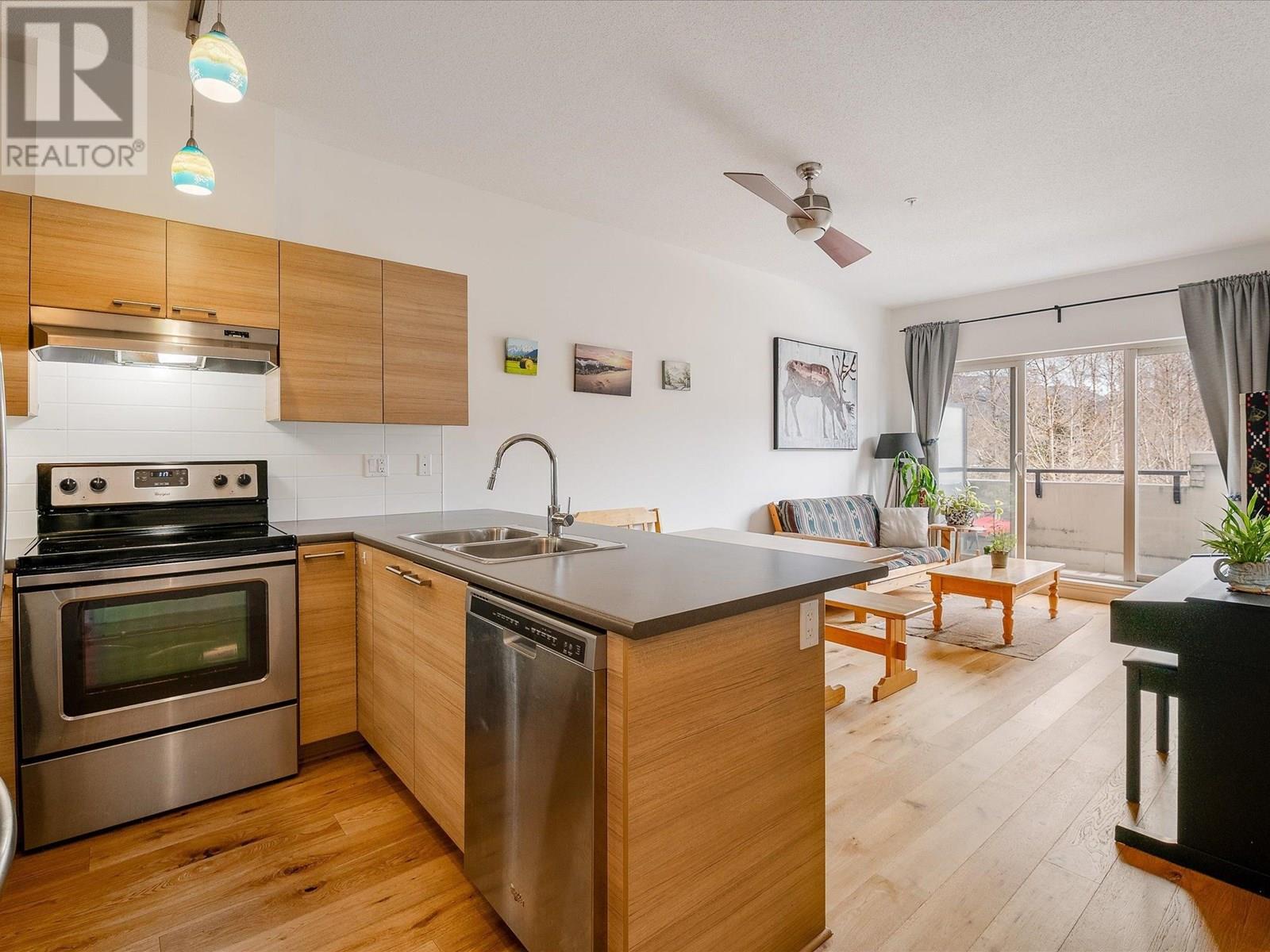 Located in the heart of downtown Pemberton, this exceptional 1-bedroom plus den condo seamlessly combines modern design with natural beauty. Just steps away from shops, restaurants, and recreational amenities, this property offers both convenience and a vibrant lifestyle. With stunning engineered hardwood floors, and an abundance of natural light, the open-concept living area feels spacious and inviting. Over-height ceilings enhance the breathtaking views of snowcapped mountain peaks. This home also offers practical conveniences such as in-suite laundry, underground parking, elevator access, and on-site mailboxes. (id:48970) Show More