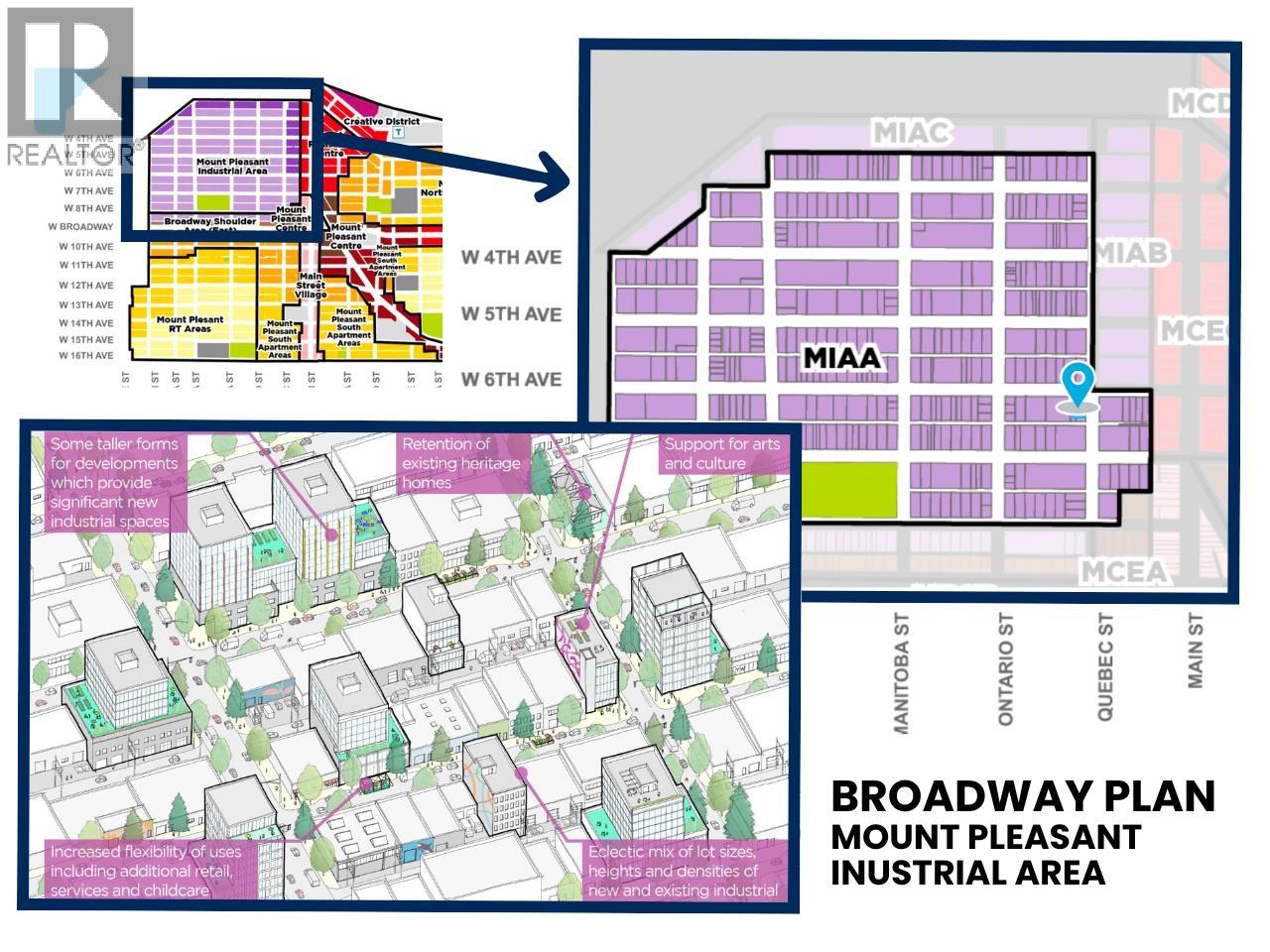 Prime opportunity in the heart of Mount Pleasant. Located within the Mount Pleasant Industrial Area (MIAA), just steps from the future Broadway Mount Pleasant Station. Subject site offers exceptional redevelopment potential, designated for flexible 4 to 11 storey mixed-use development up to 6.0 FSR. Positioned for growth in a creative, connected, and transit-rich urban node. With proximity to downtown Vancouver, tech hubs, and transit infrastructure, this site is ideally positioned for mixed-use or employment-generating redevelopment. A rare chance to invest in one of Vancouver's most dynamic and evolving neighbourhoods. (id:48970) Show More