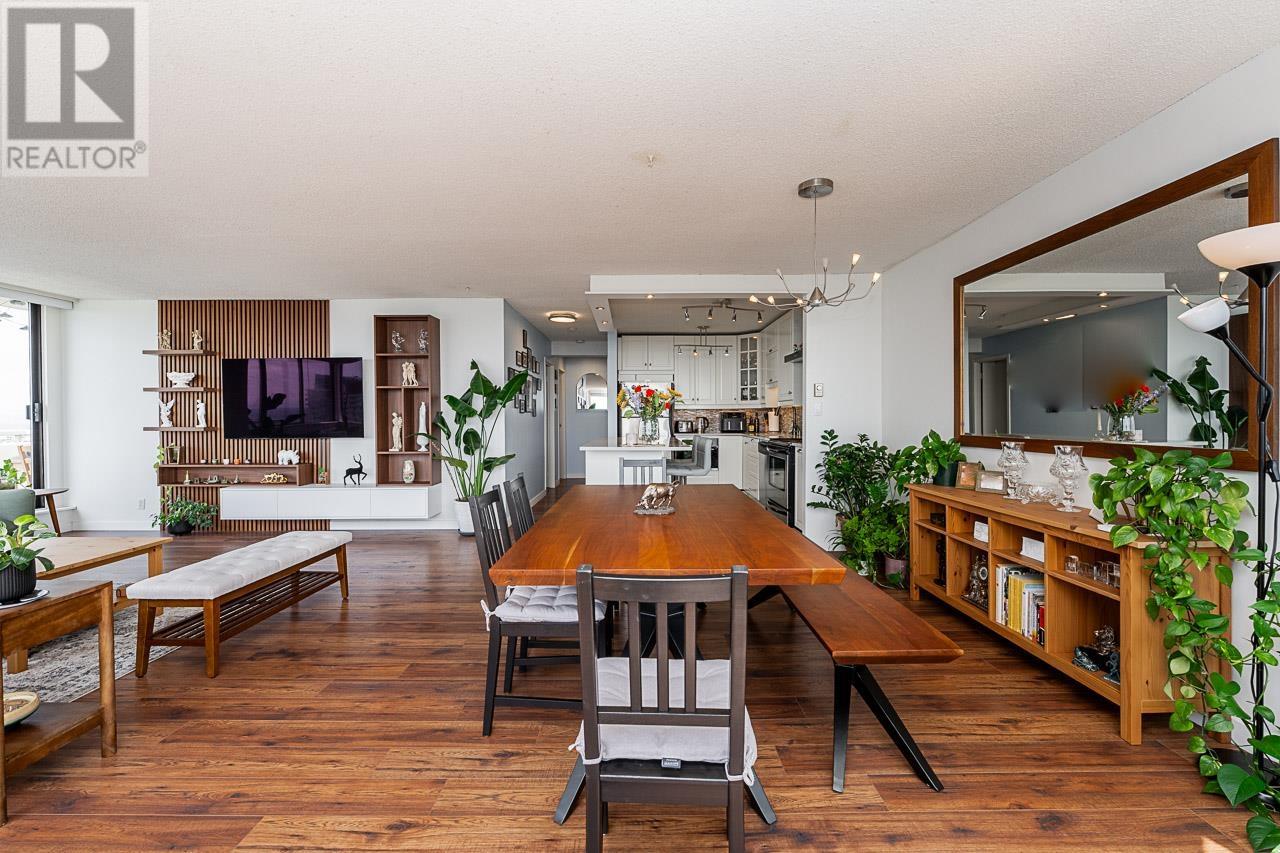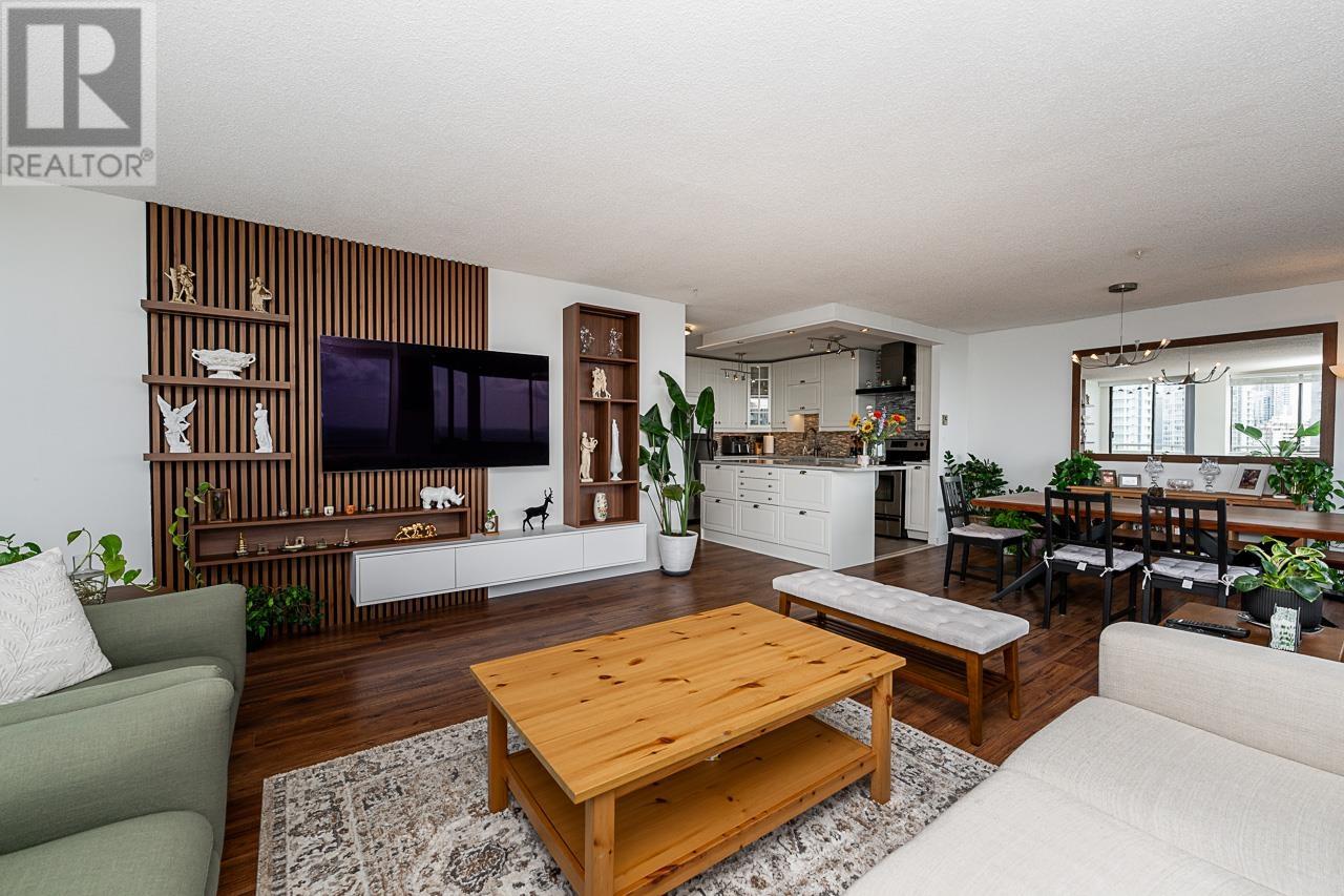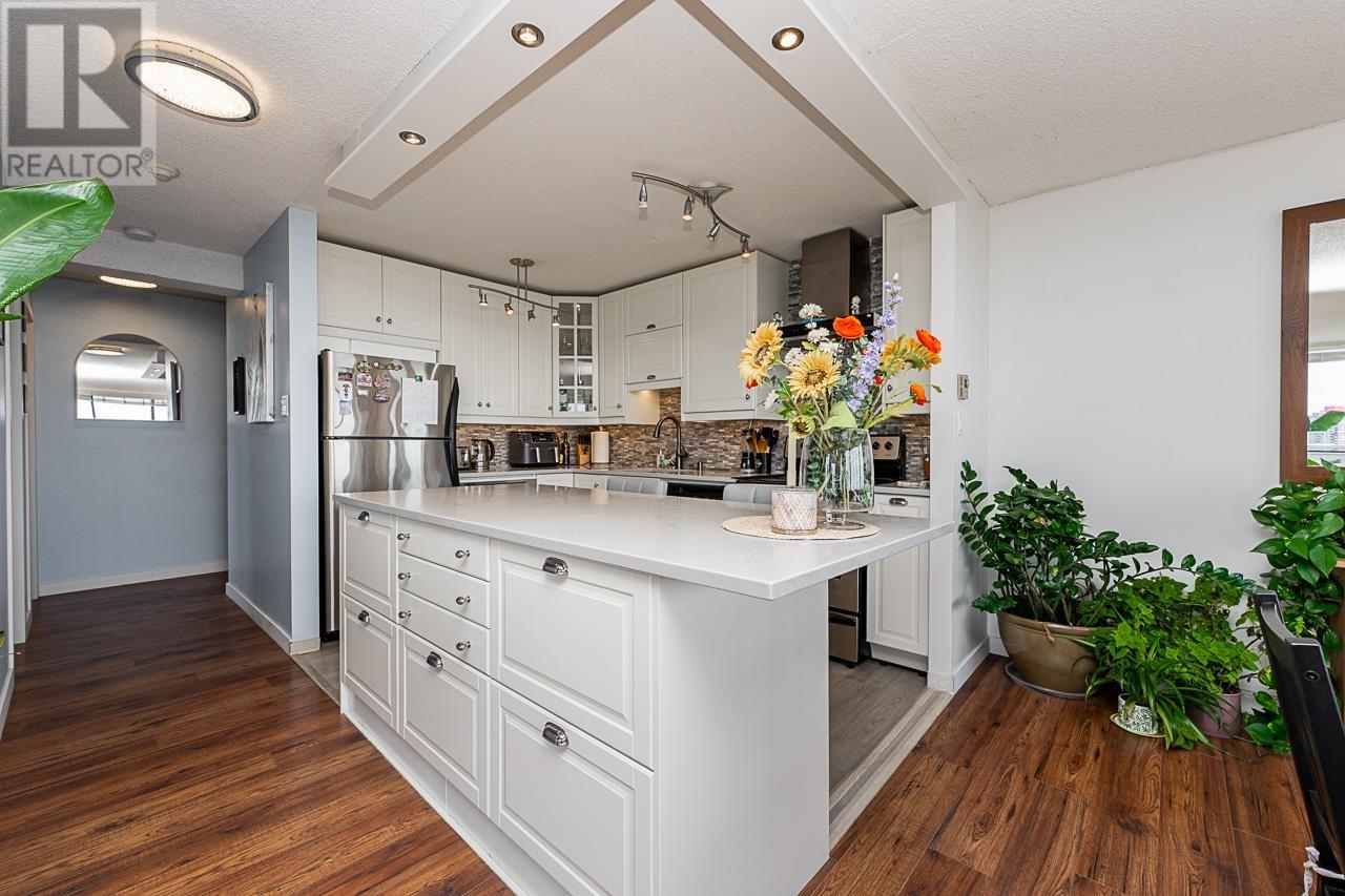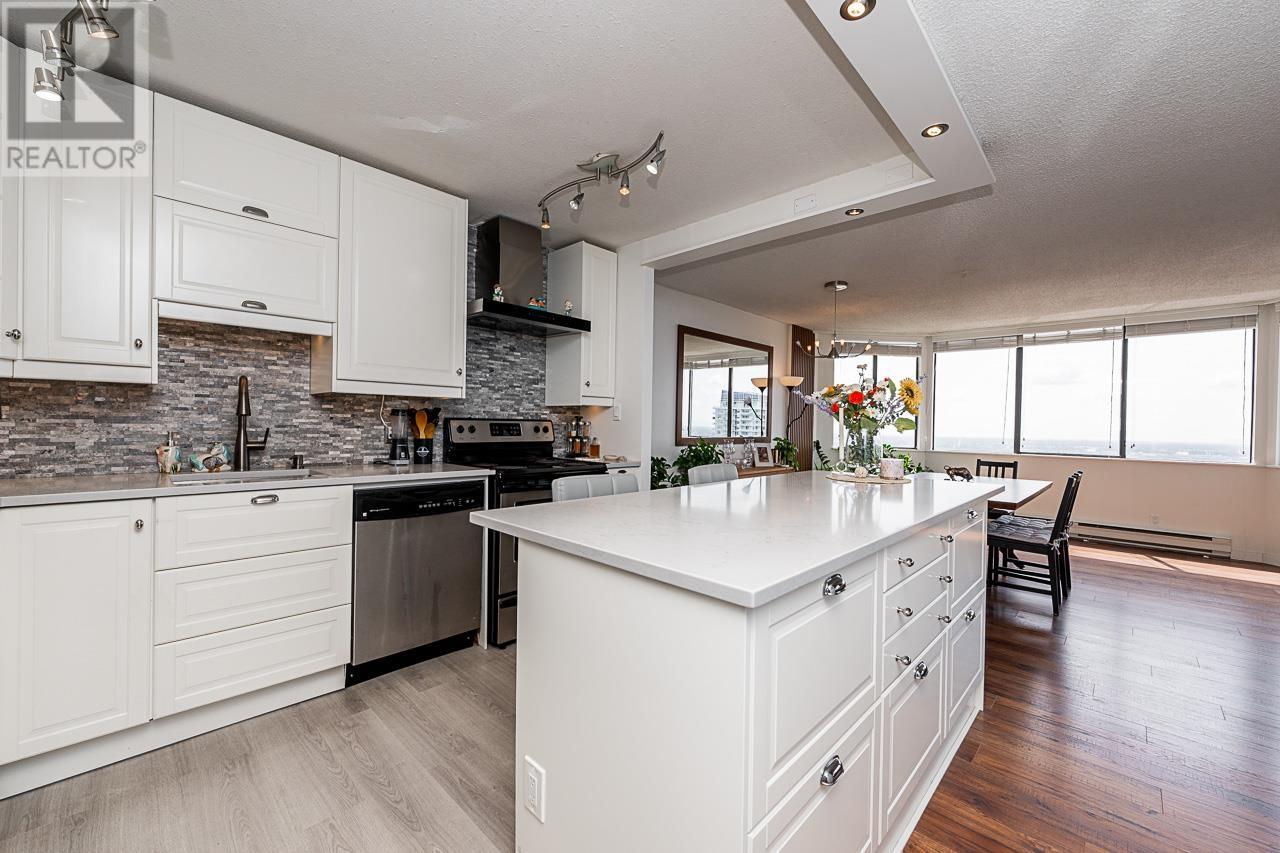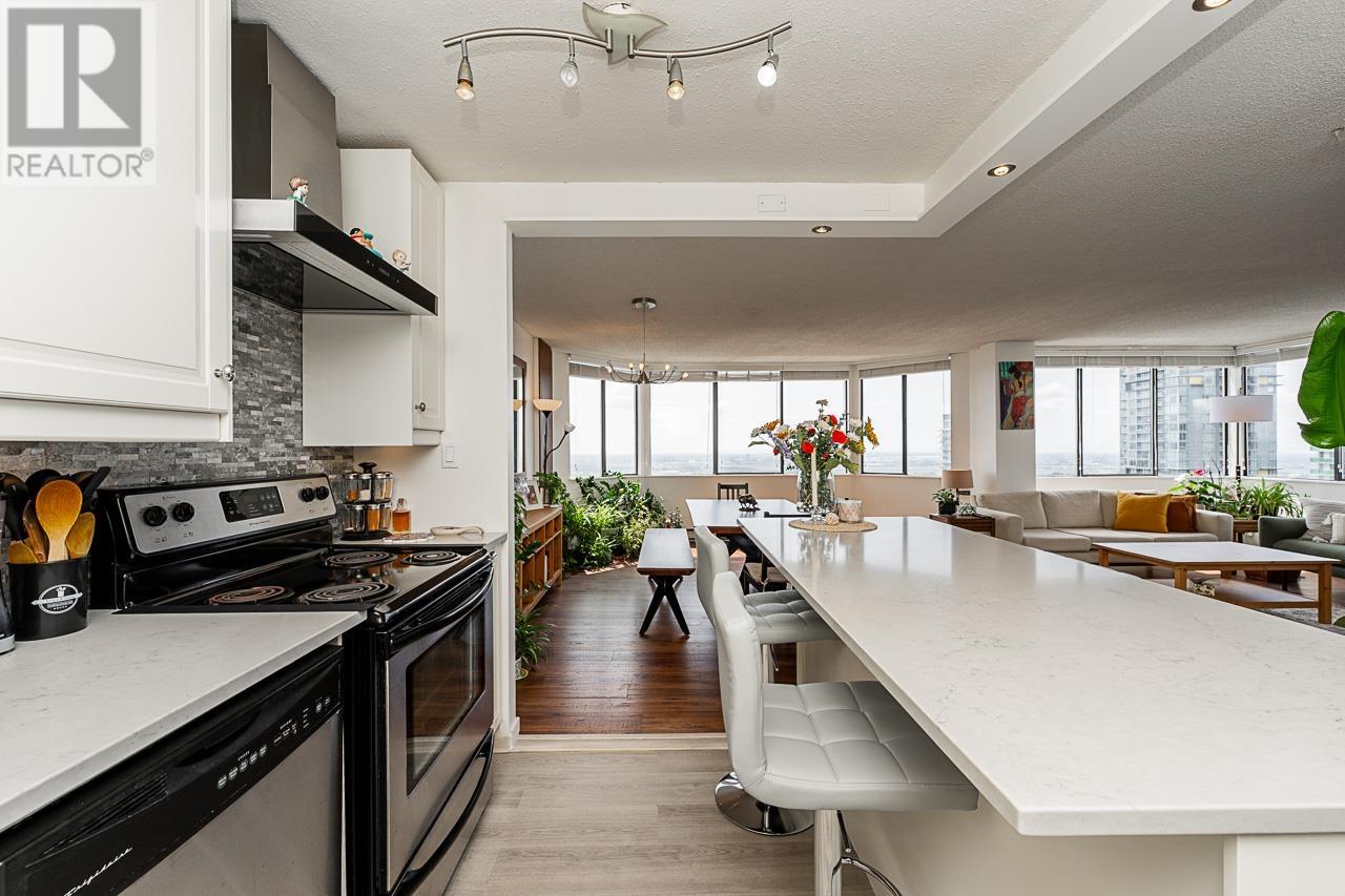 This renovated sub-penthouse delivers stunning 270° views stretching from the North Shore Mountains and Downtown Vancouver to the Fraser Valley and Mount Baker. With 2 bedrooms and 1 spa-inspired bath, this bright corner unit features a sleek modern kitchen with quartz counters, stainless steel appliances, and an oversized island perfect for cooking and entertaining. Expansive window panels fill the open-concept living and dining area with natural light, complemented by warm-toned laminate flooring throughout. Relax in the deep soaker tub and enjoy the convenience of in-suite laundry and generous storage. Situated in a well-managed concrete high-rise with outstanding amenities: a full fitness centre, squash court, basketball court, and secure entry. Steps to Metrotown, Crystal Mall, SkyTrain, Bonsor Rec Centre, shopping, and dining. Includes 1 parking and 1 storage locker. Pet- and rental-friendly-ideal for both homeowners and investors. (id:48970) Show More
