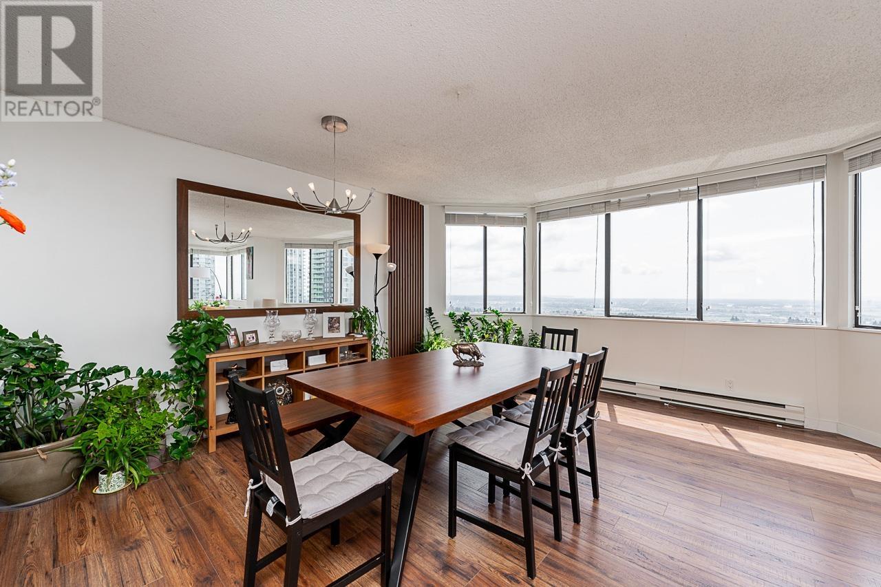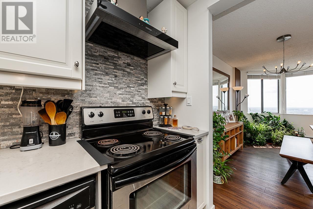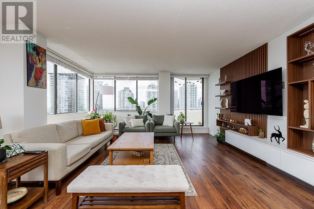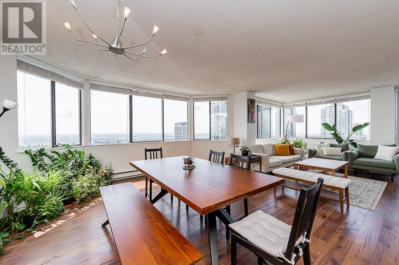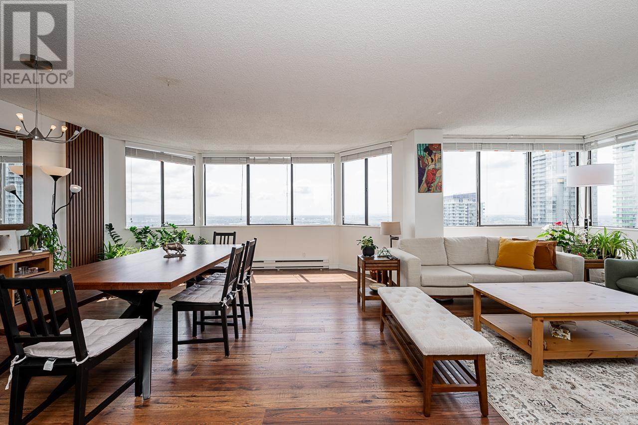 This renovated sub-penthouse delivers stunning 270° views stretching from the North Shore Mountains and Downtown Vancouver to the Fraser Valley and Mount Baker. With 2 bedrooms and 1 spa-inspired bath, this bright corner unit features a sleek modern kitchen with quartz counters, stainless steel appliances, and an oversized island perfect for cooking and entertaining. Expansive window panels fill the open-concept living and dining area with natural light, complemented by warm-toned laminate flooring throughout. Relax in the deep soaker tub and enjoy the convenience of in-suite laundry and generous storage. Situated in a well-managed concrete high-rise with outstanding amenities: a full fitness centre, squash court, basketball court, and secure entry. Steps to Metrotown, Crystal Mall, SkyTrain, Bonsor Rec Centre, shopping, and dining. Includes 1 parking and 1 storage locker. Pet- and rental-friendly-ideal for both homeowners and investors. (id:48970) Show More