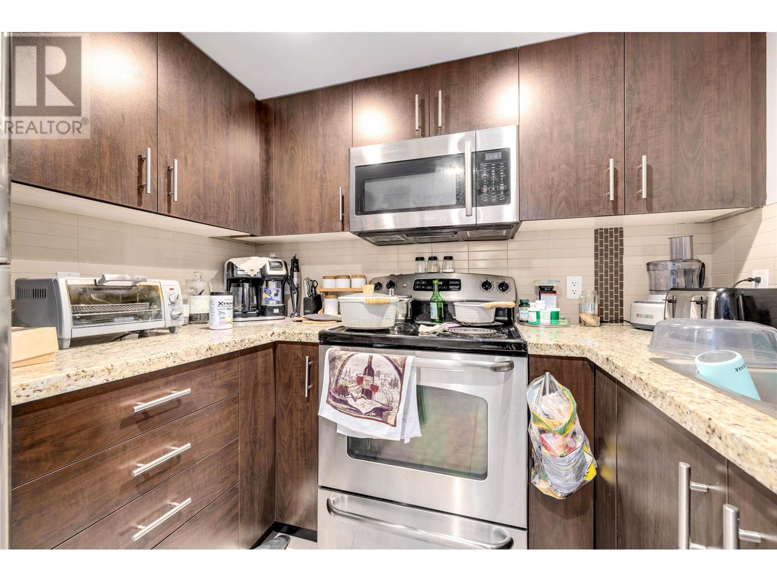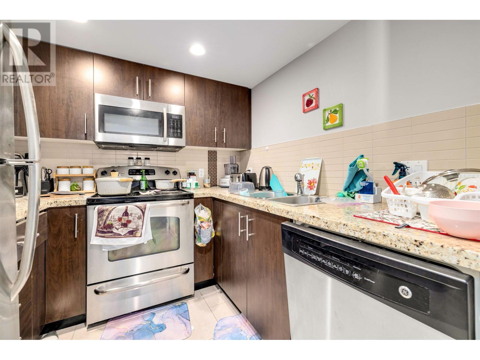 Welcome to this bright and generously sized 1 bed, 1 bath condo in the highly sought-after Brewery District. Ideally located just steps from the SkyTrain, bus routes, restaurants, and shopping. Offering over 700 sqft of well-designed living space, this home features laminate flooring, granite countertops, stainless steel appliances. Bonus: 2 parking stalls, Recently replaced washer, Pet and rental friendly-Don´t miss this opportunity! (id:48970) Show More