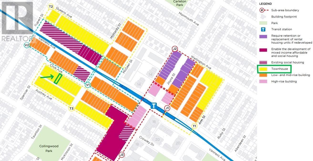 Zoned RM-7AN that currently allows for townhomes with land assembly. Future potential for re-zoning to allow for low to mid-rise building. Home is in great condition to rent and hold for revenue before an assembly occurs. Double door entrance with spiral staircase. Hardwood flooring on both levels & parquet flooring in 2 bedrooms on upper level. Peninsula kitchen has window sink & granite countertops and is open to the eating area & family room. large solarium connected to the huge sundeck, all facing South. Primary bedroom has walk-in closet & ensuite with newer raised sink. Jacuzzi tub in main bathroom. Home features hot water baseboard heating, built-in vacuum & hot water on demand. Lower level has separate entry & kitchen. Back lane access. 5 minute walk to Joyce-Collingwood Station. (id:48970) Show More