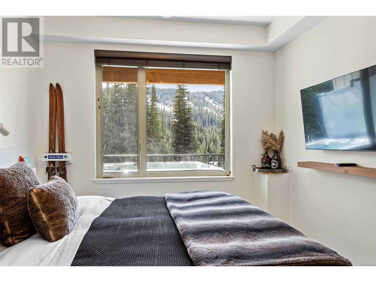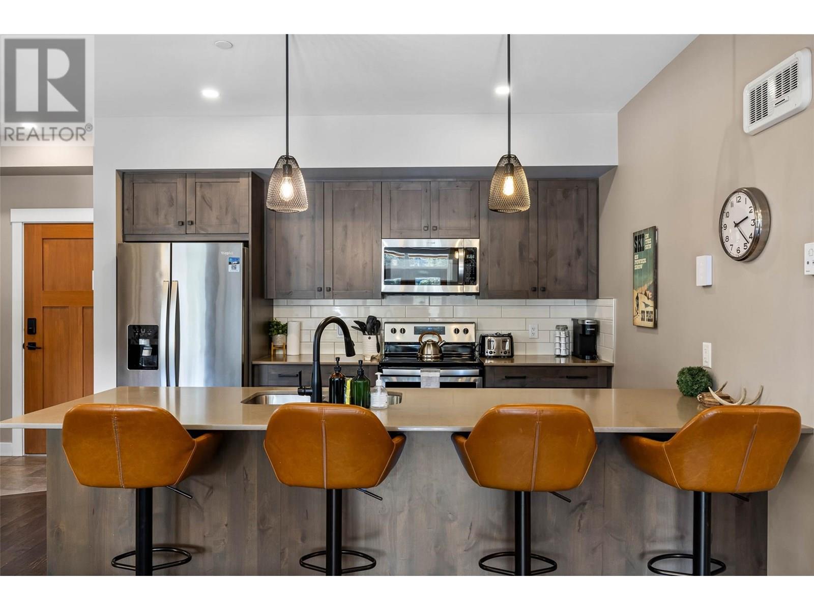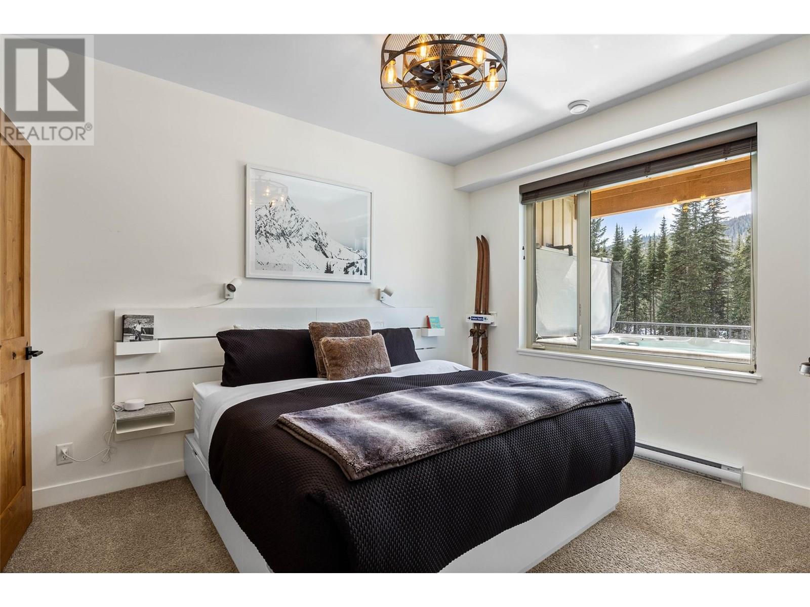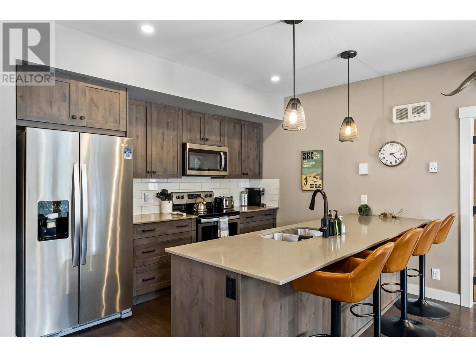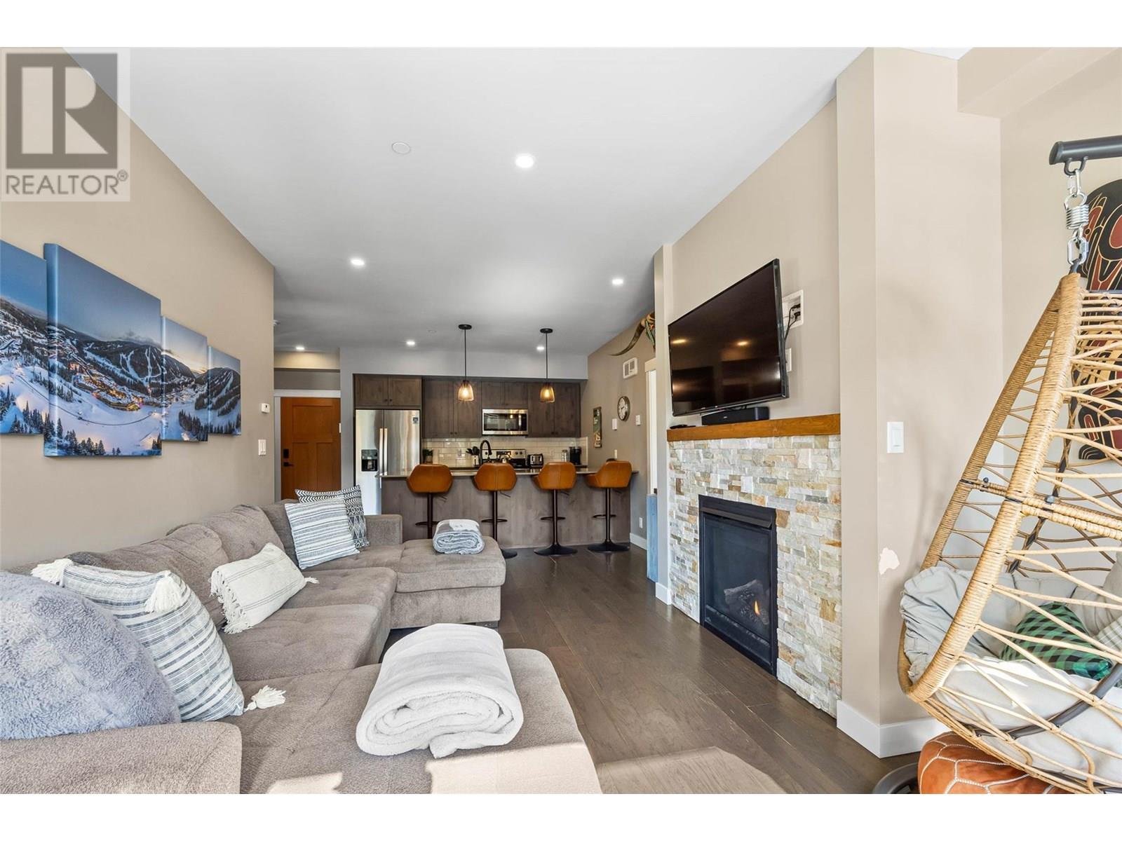 RARE ski in/out, 2 bedroom, 2 bathroom end unit with level entry (no stairs) and attached 1 car private garage in the East Village! Enjoy the sleek and modern design of this 2019 built condo featuring a popular open concept plan with a spacious kitchen, quartz countertops, plenty of cabinetry, extra large food pantry and oversized eat-in island for the ultimate entertaining experience! The living space is warm and inviting with engineered wood flooring throughout and a comfy sectional with double loungers to warm up in front of a cozy fire, after a day on the slopes. Open the double glass paned doors to expand your living space outdoors onto the spacious covered deck with private hot tub and outstanding panoramic views to Mt. Morrisey, summit of Mt. Tod and sunsets down the valley. The luxurious primary bedroom features a king size bed, sleek built-in headboard, walk through closet and convenient ensuite bath. There are many custom features of this property including radiant heated tile in entry and baths, beautiful custom shelving and closets in the primary bedroom and 2nd bathroom and custom lockers, bike racks and workbench in the garage. Offered fully furnished. NO rental restrictions. Located opposite the future East Village, Orient & Morrisey chairlift hubs, Nordic Ski Centre, Nordic & XC mountain bike trails, and brand new tennis & pickle ball courts. See listing for video & 3D tours. (id:48970) Show More