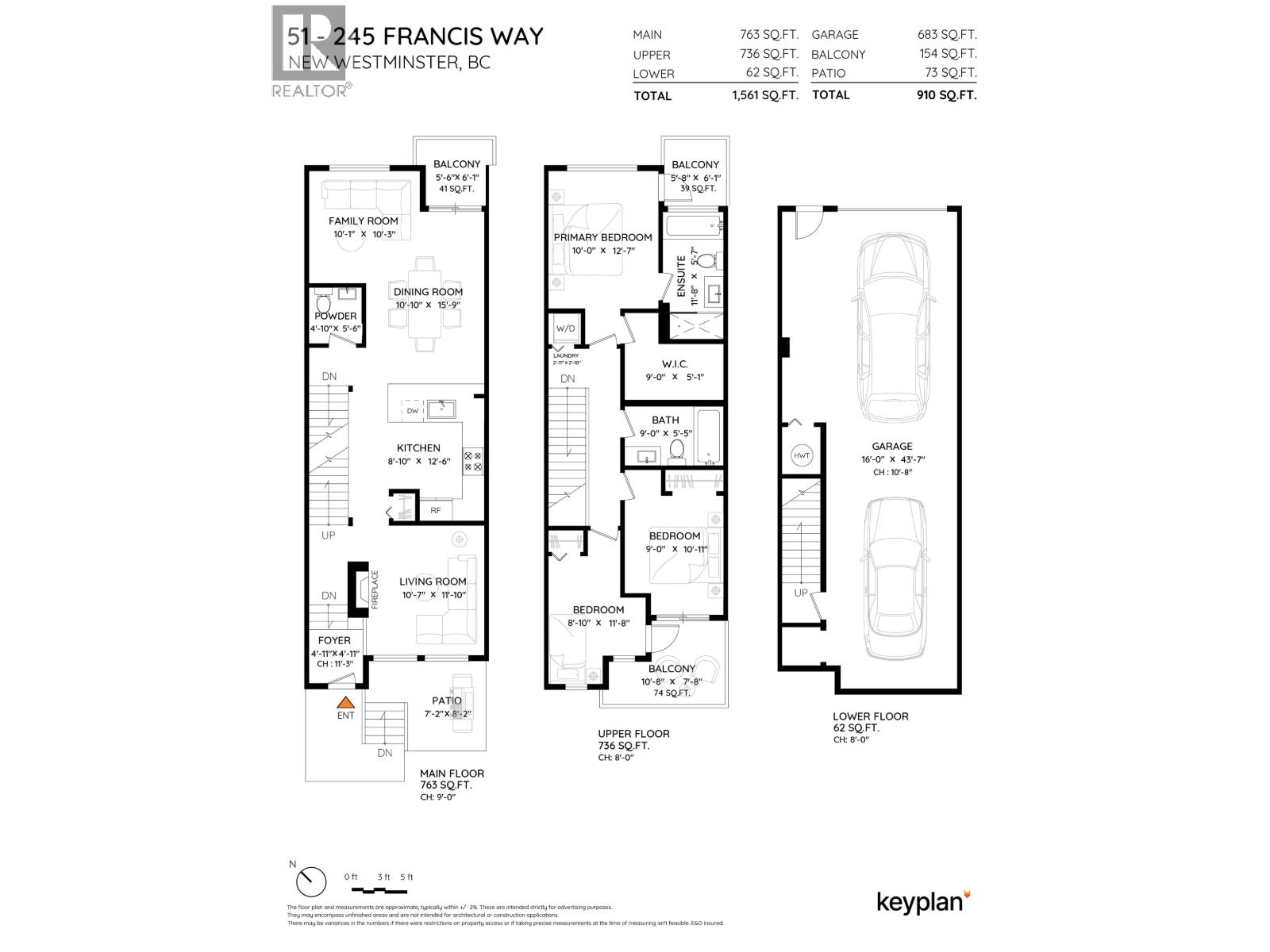 Open house Sunday, July 13th 2-4PM GLENBROOKE - Welcome to Victoria Hill! This well-maintained 3-bedroom, 2.5-bath, 1,561 sq ft, 3-level townhome offers a bright, open-concept layout with 9 ft ceilings on the main floor. 2022/23 updates include: Upgraded powder room with bidet control, hot water tank & heat pump (indoor heads in all bedrooms & main floor) Updated kitchen appliances, sink, faucet, washer/dryer, lighting, electric fireplace & window treatments. Laminated flooring throughout. The primary suite features a spacious walk-in closet. Enjoy 3 balconies (one overlooking the park) plus a private patio. The oversized tandem garage (16' x 43'7") provides ample storage & workshop space. Resort-style amenities at The Boiler House: Movie theatre, Games room, Fully equipped gym Clubhouse available for rent. Pet & rental friendly! Perfect for first-time buyers, uprisers, downsizers, or investors. Walk to Queen´s Park, Glenbrook Ravine Park, Canada Games Pool, riverfront trails, and a commuter bus to SkyTrain. (id:48970) Show More