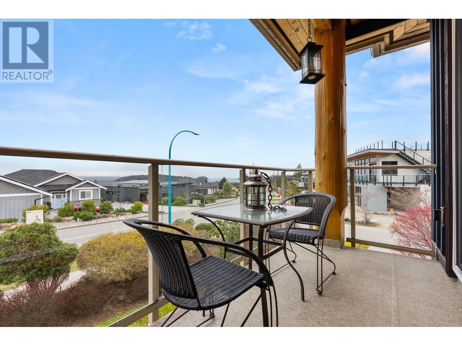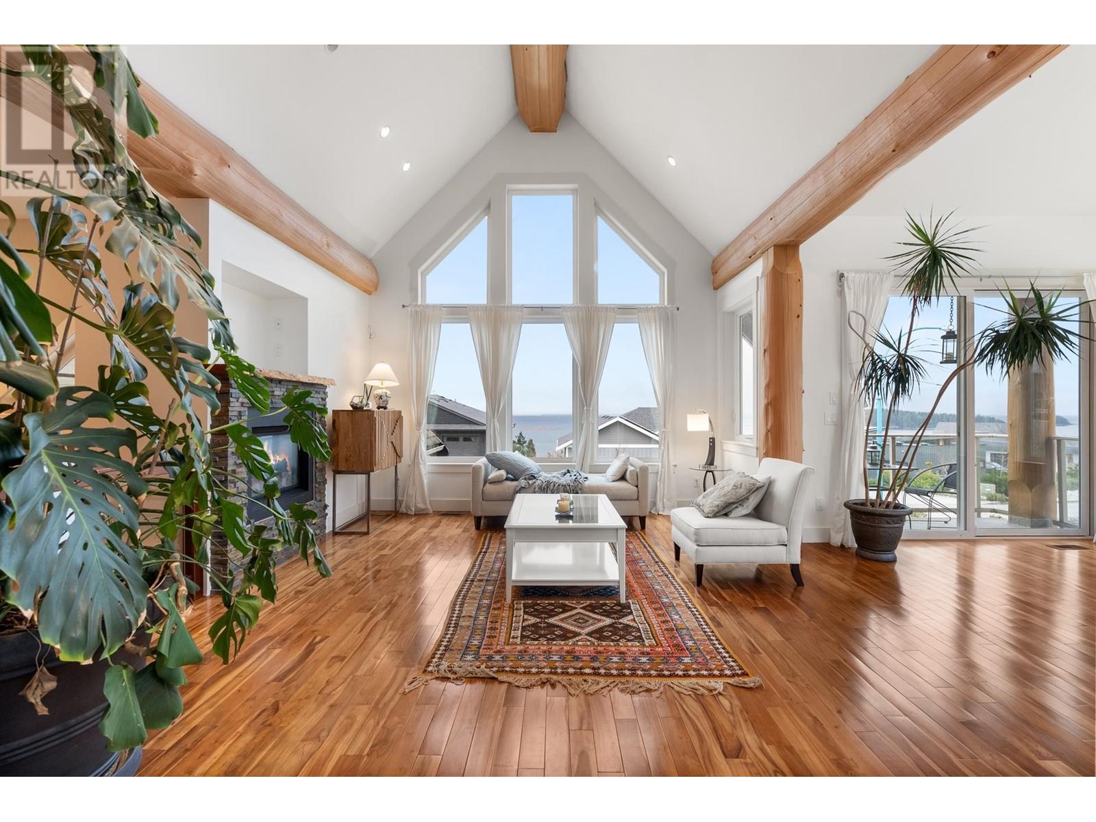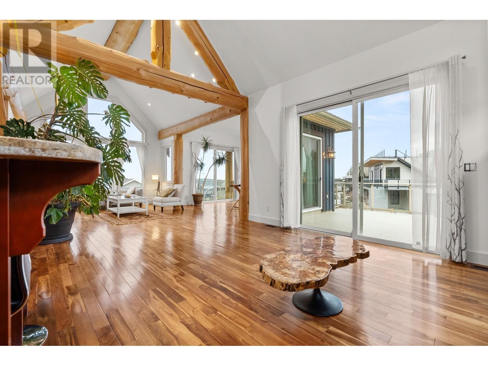 This West Coast timber-frame home in Trail Bay Estates offers breathtaking ocean and island views. Majestic log beams frame the exterior, while rich wood accents, granite counters, and slate tile create a warm, custom interior. The 3-bed, 4-bath layout includes a flex room ideal for teens and a legal suite with a Murphy bed. The kitchen features cherry cabinets, granite counters, and a pantry. The primary suite boasts a soaker tub, gas fireplace, huge walk-in closet, and ocean views. Soaring vaulted ceilings in the living and dining areas enhance the open-concept design. Relax on the 500+ sq. ft. deck with space for a hot tub. A laundry/mudroom is conveniently off the double garage. Mature landscaping adds curb appeal. Steps to downtown Sechelt! (id:48970) Show More