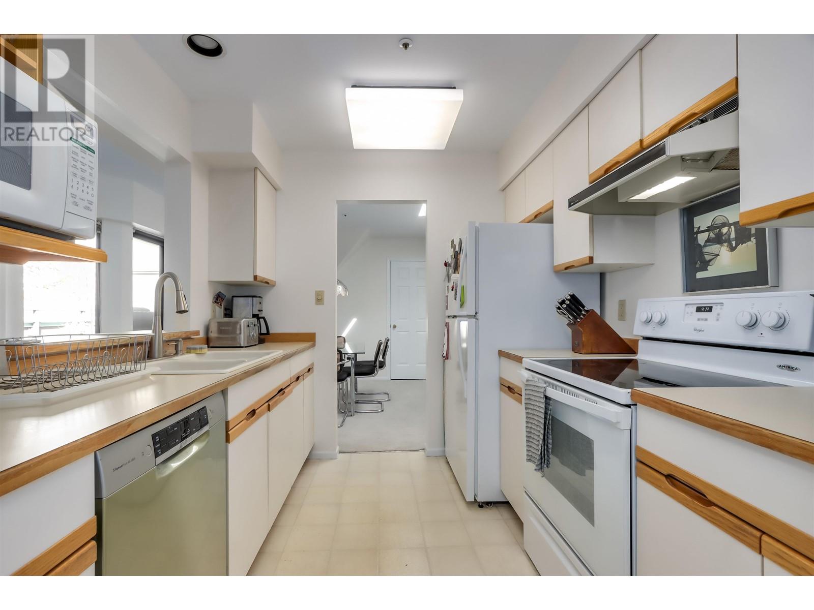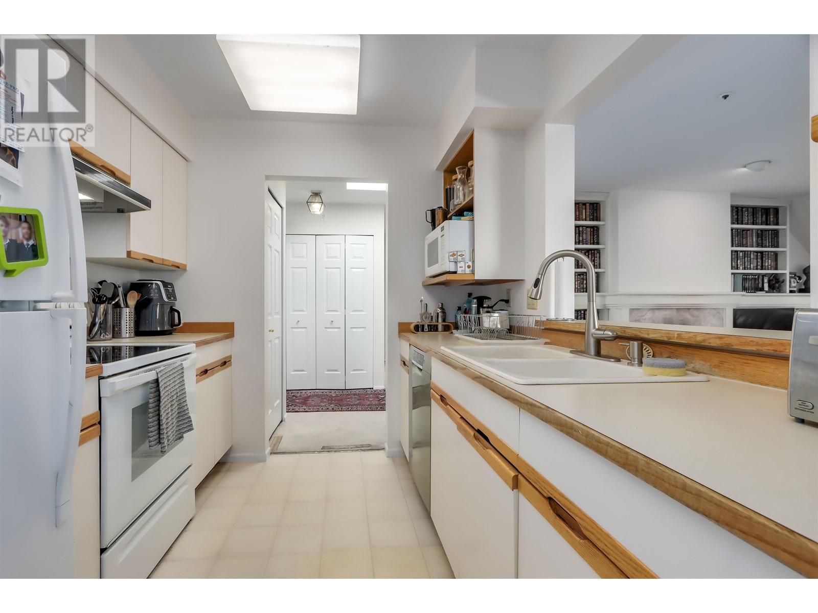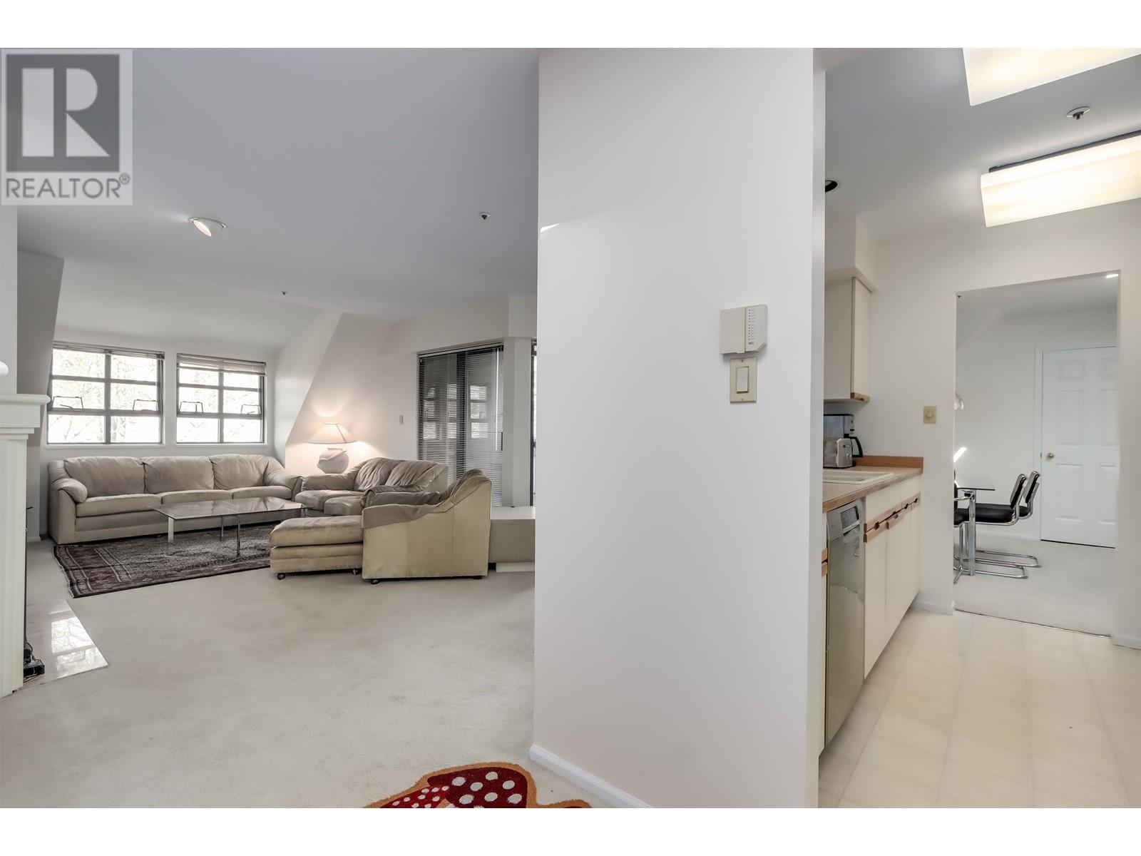Bright, spacious, private top floor suite in Connaught Gardens. One owner home. Only 4 units on top floor with No adjoining walls. Living room features gas fireplace, Built in cabinets for books, tv and ?. Living & Dining rooms can fit your house size furniture. Wine storage room off of dining room. Galley style kitchen with stacked laundry beside. 2 full bathrooms, Large ensuite with bath. Primary and 2nd bedroom are huge. Skylights and 3 sliding glass doors in living areas provide plenty of sunlight. Two large decks to enjoy. 2 side by side parking spots and a storage locker. Terrific location, short walk shops, restaurants, buses and Skytrain. Make this home yours (id:48970) Show More