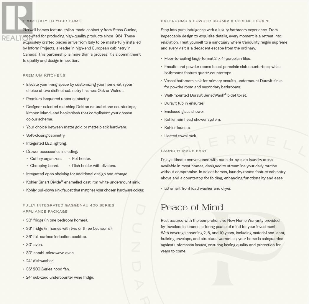 Welcome to Pierwell, a limited collection of 36 oceanside residences in Dundarave Village. This 3 bed and den townhome features 9'10 ceilings, private front entry, attached 2-car gated garage, southern exposure, ocean views, and optional elevator upgrade. Crafted by Arcadis IBI group, Pierwell features thoughtful layouts, generous outdoor spaces, striking architecture and concrete construction. Interiors by award-winning Cristina Oberti design, Italian-made cabinetry by Stosa Cucine and Inform, Intek closet systems, state-of-the art Gaggenau 400 series appliance package, Sub-Zero wine fridge, herringbone oak hardwood flooring, and air conditioning. Residents will enjoy exclusive access to the gym, yoga space, and sauna. Enjoy peace of mind with a 2-5-10 New Home Warranty. (id:48970) Show More
