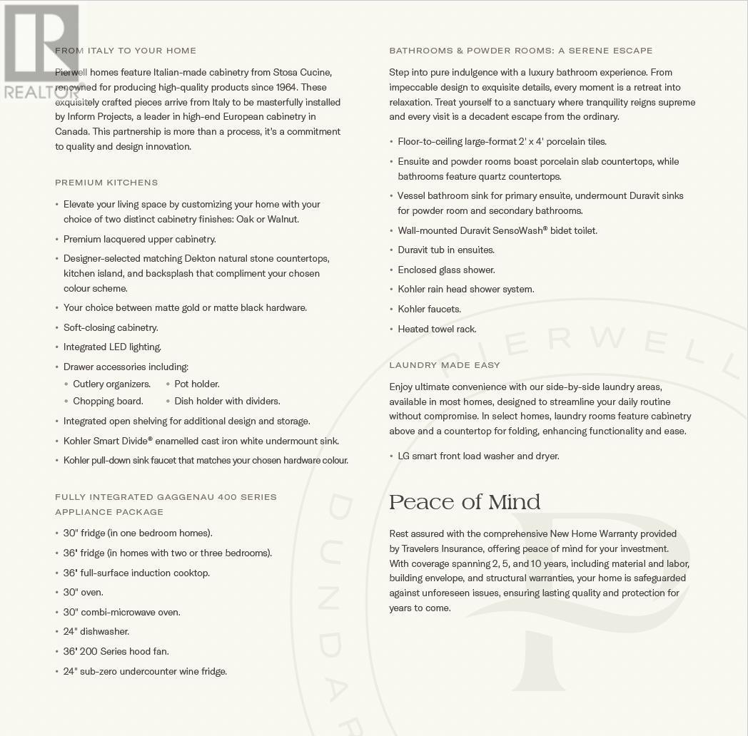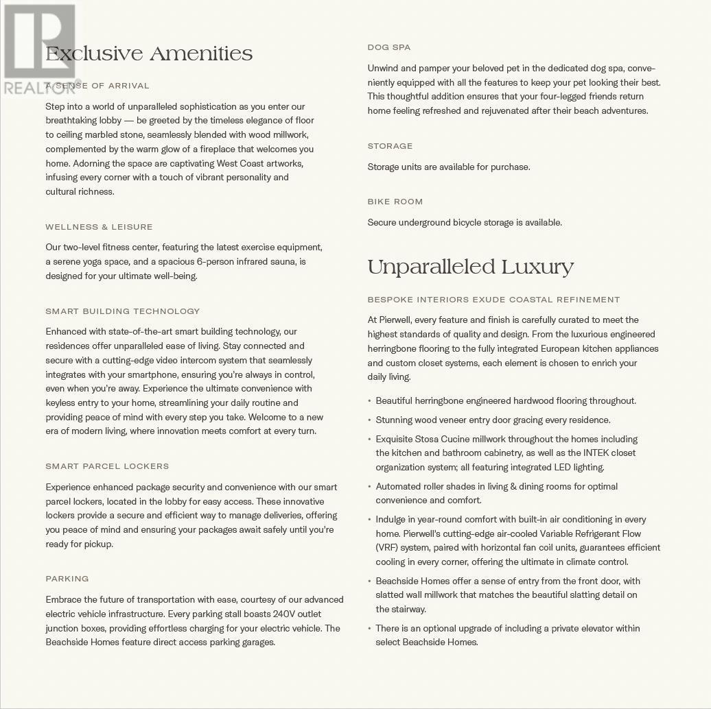 Welcome to Pierwell, a limited collection of 36 oceanside residences in Dundarave Village. This corner 3 bed and Den townhome features additional windows, 9'10 ceilings, private front entry, attached 2-car gated garage, southern exposure, ocean views, and optional elevator upgrade. Crafted by Arcadis IBI group, Pierwell features thoughtful layouts, generous outdoor spaces, striking architecture and concrete construction. Interiors by award-winning Cristina Oberti design, Italian-made cabinetry by Stosa Cucine and Inform, Intek closet systems, state-of-the art Gaggenau 400 series appliance package, Sub-Zero wine fridge, herringbone oak hardwood flooring, and air conditioning. Residents will enjoy exclusive access to the gym, yoga space, and sauna. Enjoy peace of mind with a 2-5-10 year New Home Warranty. (id:48970) Show More